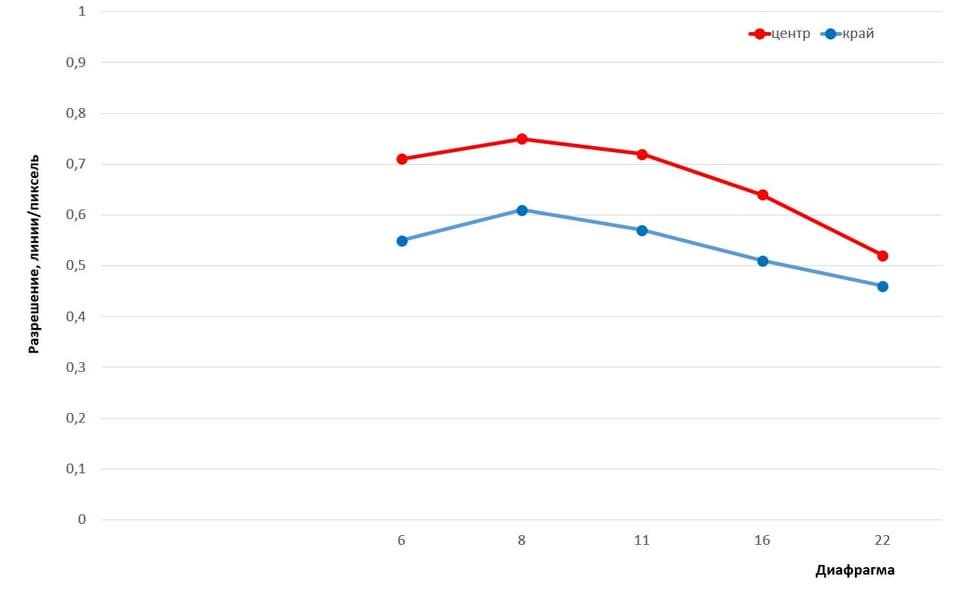Разрешение заметно снижается, его пик отмечается при F8. Начиная с F11 и далее проявляется пагубное влияние дифракции, но при этом уменьшается разрыв между разрешением в центре и на периферии кадра.