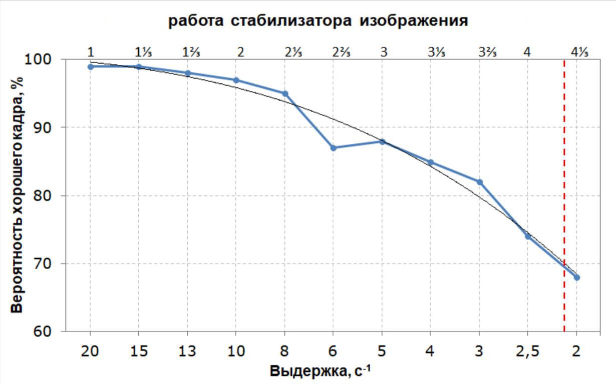 Первый снимок сделан с выдержкой, примерно соответствующей эквивалентному фокусному расстоянию объектива (1/30 с) исходя из формулы «выдержка для съемки четкого изображения должна равняться единице, деленной на фокусное расстояние». Каждый последующий кадр делался с увеличением длительности выдержки на одну ступень экспозиции по сравнению с предыдущим (1/15 c, 1/8 c, 1/4 c и т. д.). Последний снимок сделан с выдержкой 2 (!) секунды. Внутрикамерная стабилизация отлично отработала такую длительность, и это, говоря откровенно, абсолютный рекорд в нашей практике. По сравнению с первым снимком серии ее эффективность составила 6 ступеней экспозиции — это отличный результат.