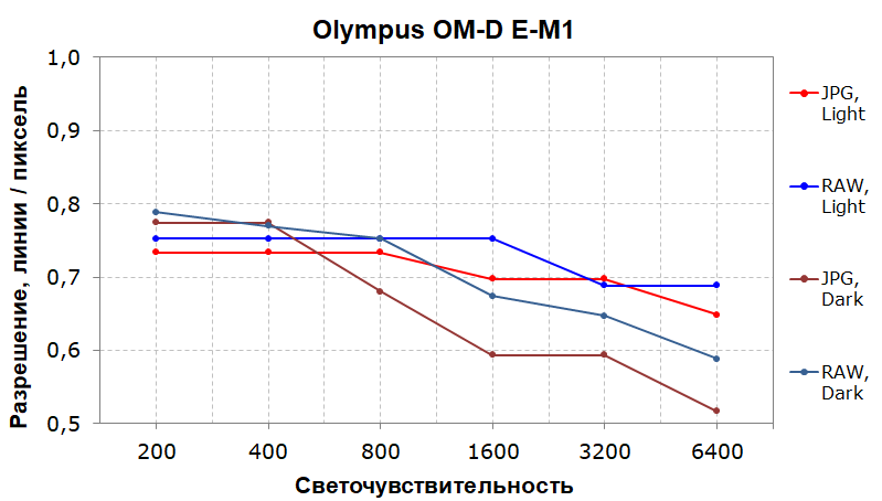 В светлой сцене разрешение RAW-файла на низких значениях светочувствительности едва достигает 80%, что нельзя назвать высоким результатом, однако это наилучший результат среди протестированных режимов. При съемке в JPEG внутренняя программная обработка камеры функционирует очень хорошо и позволяет сохранить почти 75% исходных деталей вплоть до ISO 800 и около 70% вплоть до ISO 6400. В целом, в JPEG камера снимает достаточно стабильно независимо от освещенности. А вот про RAW подобного сказать нельзя: уже на ISO 400-800 начинается сильное падение разрешения, особенно в темной сцене. Таким образом, как ни странно, съемка на высоких ISO в JPEG иногда предпочтительнее, чем в RAW.