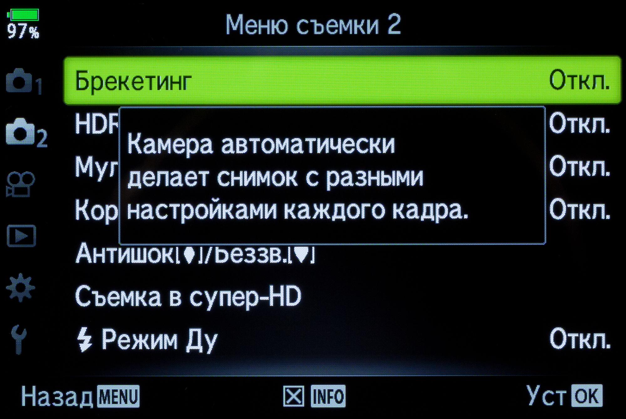 | Автобрекетинг | по экспозиции (2/3/5 кадров с шагом в 1, ⅔, ⅓ EV), по ISO (3 кадра с шагом в ⅓, ½, 1 EV), по балансу белого (3 кадра с шагом 2, 4, 6 майред) |