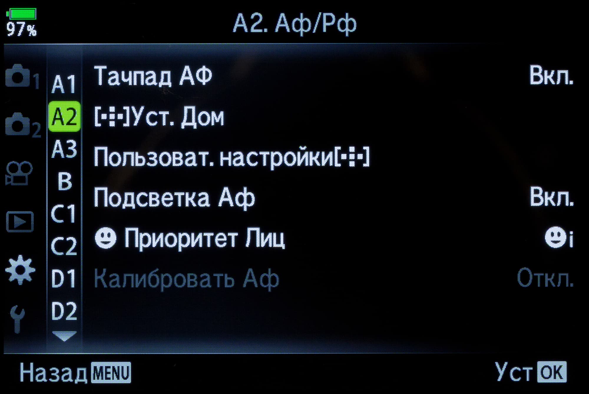 Автоматическая фокусировка доступна в трех режимах: однокадровая (S-AF), непрерывная (C-AF) и непрерывная следящая (C-AF Tr). В последнем случае после выбора зоны автомат производит отслеживание ее положения в поле кадра, удерживая нужный объект в зоне резкости.