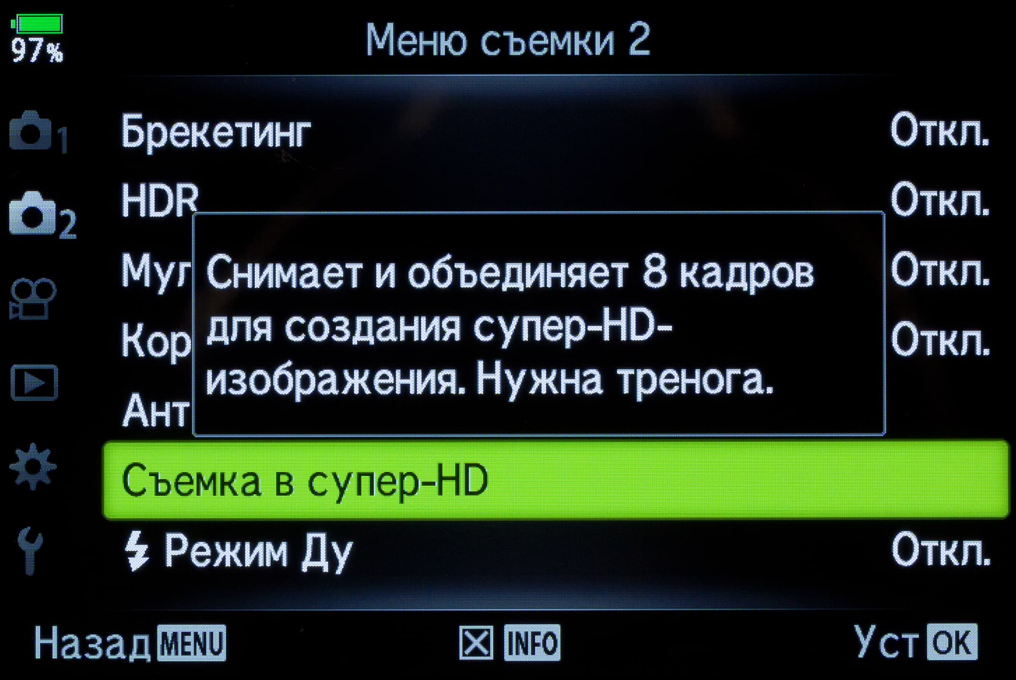 - съемка со сверхвысоким разрешением (до 80 Мп) посредством многократного экспонирования со сдвигом сенсора;