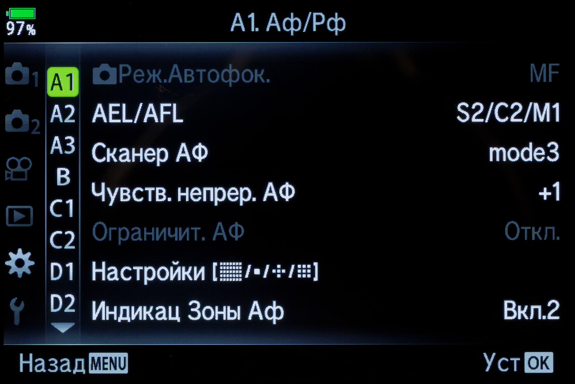 Под большой палец правой руки хорошо ложится кнопка экспопамяти и принудительной фокусировки (в зависимости от положения рычажка вокруг нее). Им же нетрудно дотянуться до пятипозиционного переключателя. Отдельного джойстика для выбора зоны фокусировки нет, но и навипад справляется с этим неплохо.