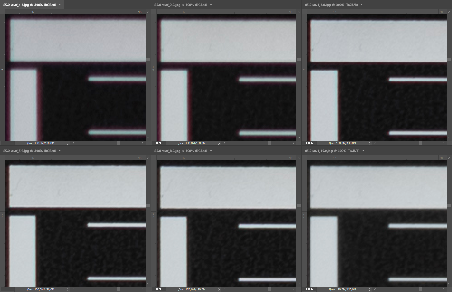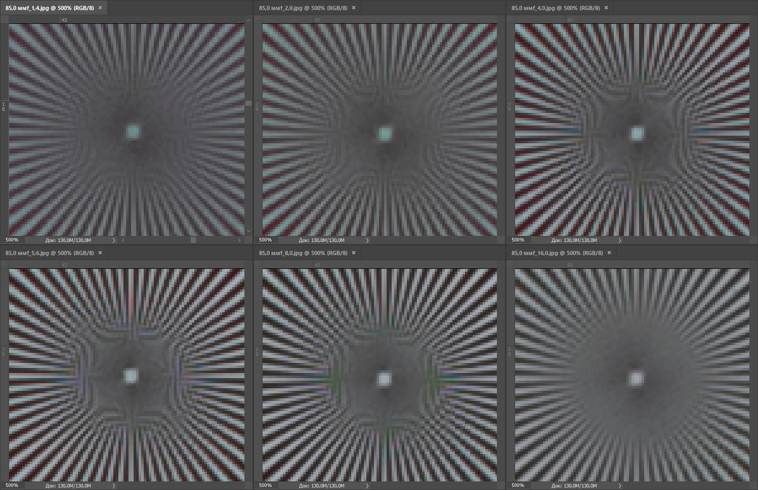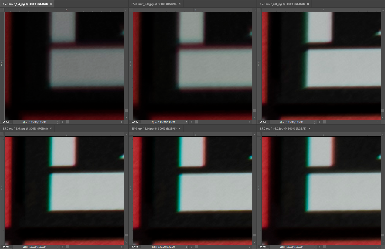 | На всех скриншотах верхний ряд: f/1,4 — f/2,0 — f/4,0, нижний ряд: f/5,6 — f/8,0 — f/16 | |||