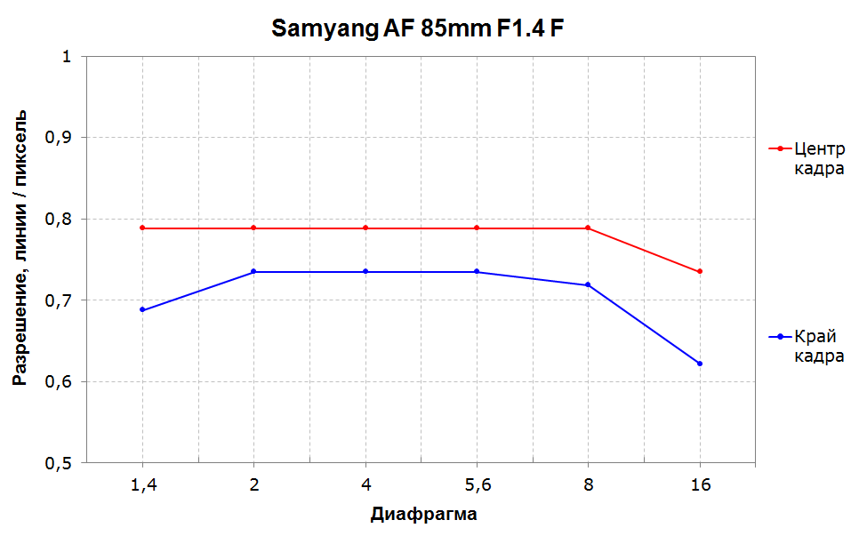 Разрешающая способность данного объектива достаточно скромна, чтобы не сказать больше. И хоть график достаточно ровный, на открытой диафрагме край кадра опускается ниже 0,7 линий на пиксель, что больше соответствует оптике в китовых зумах.