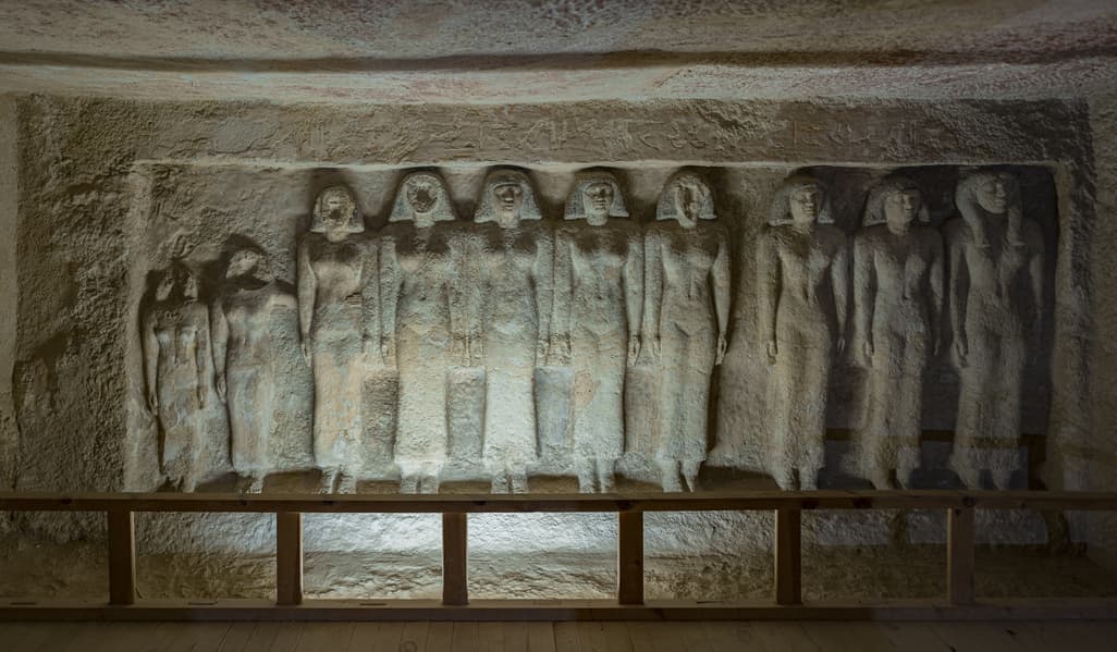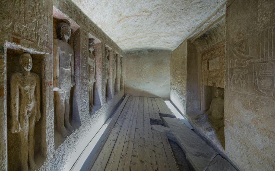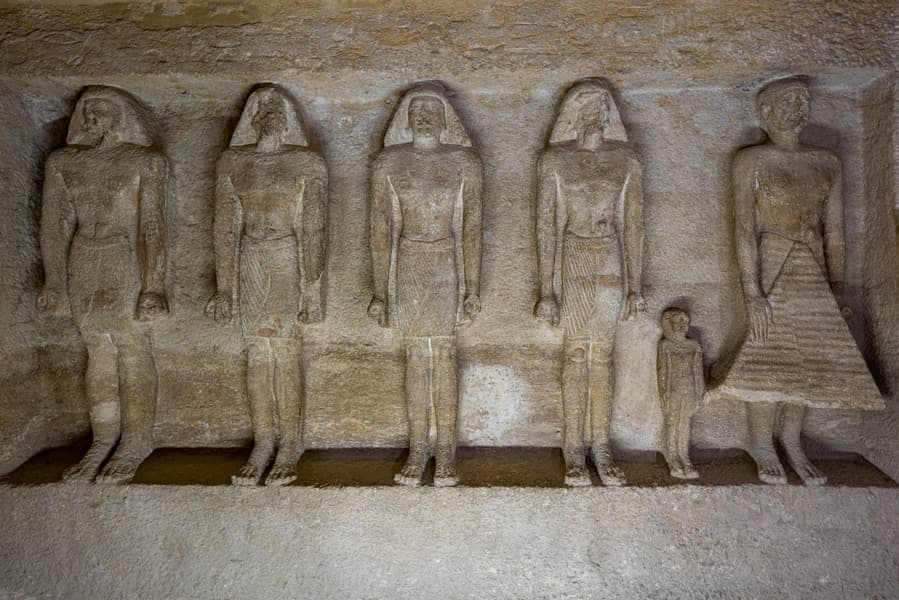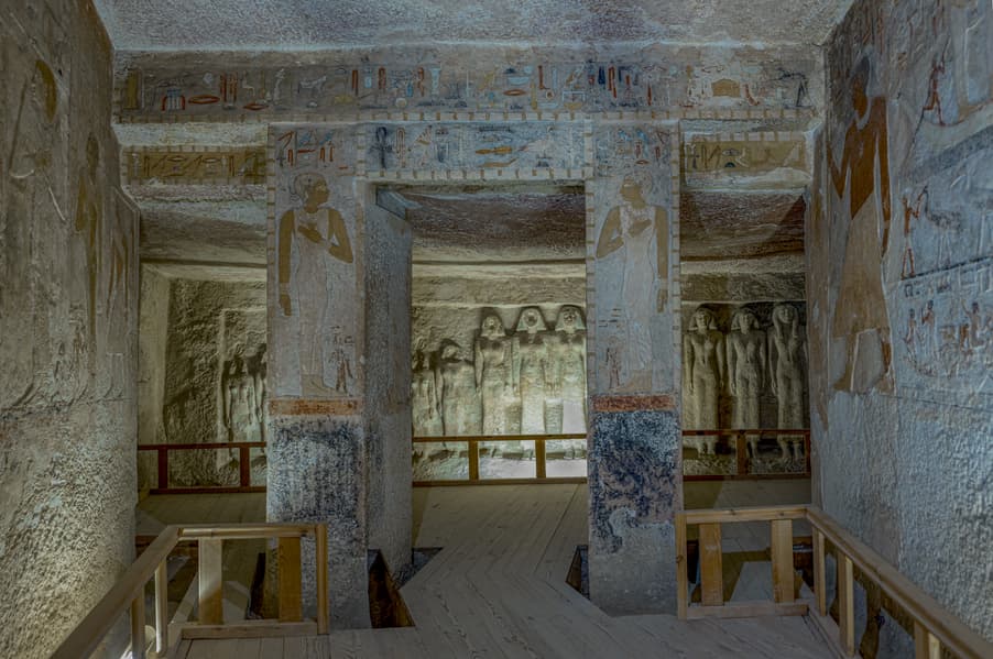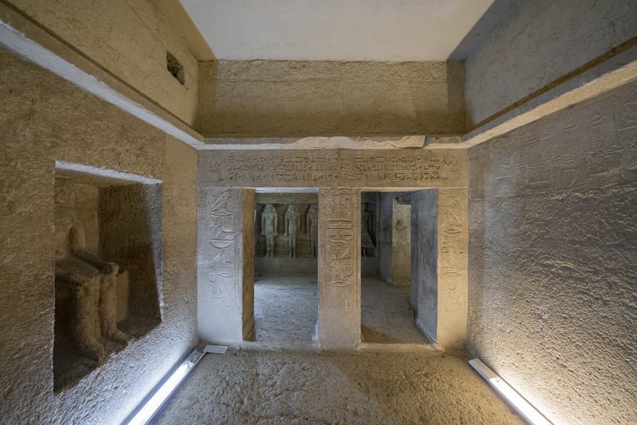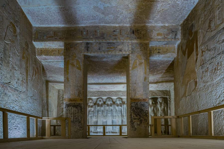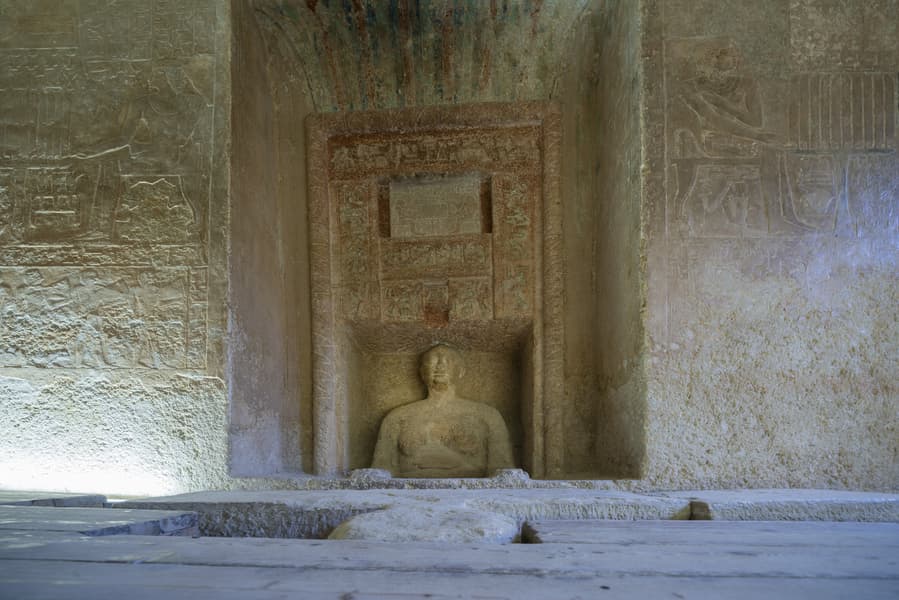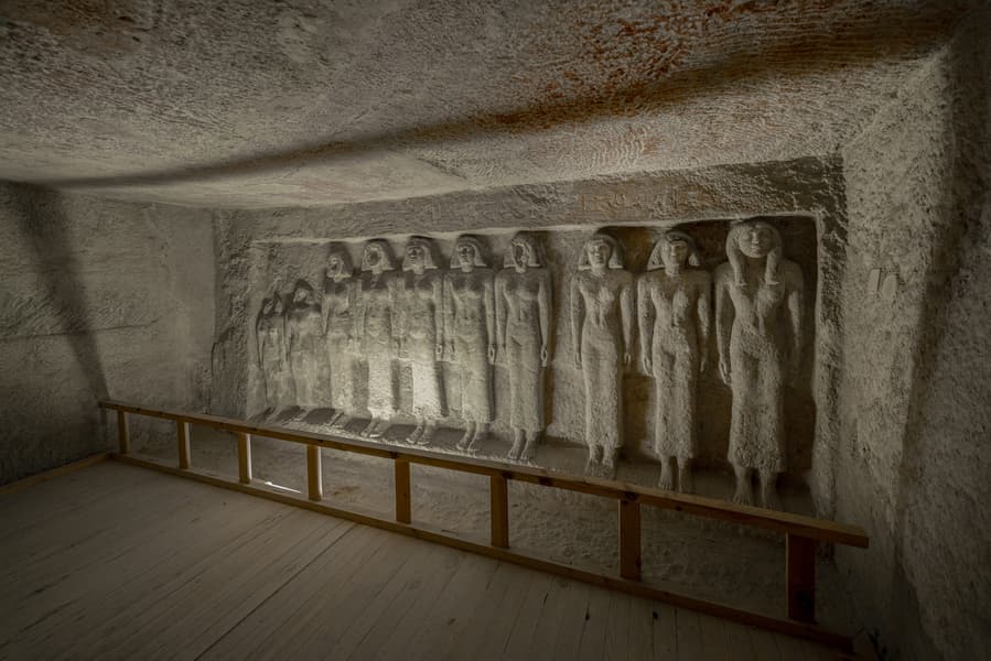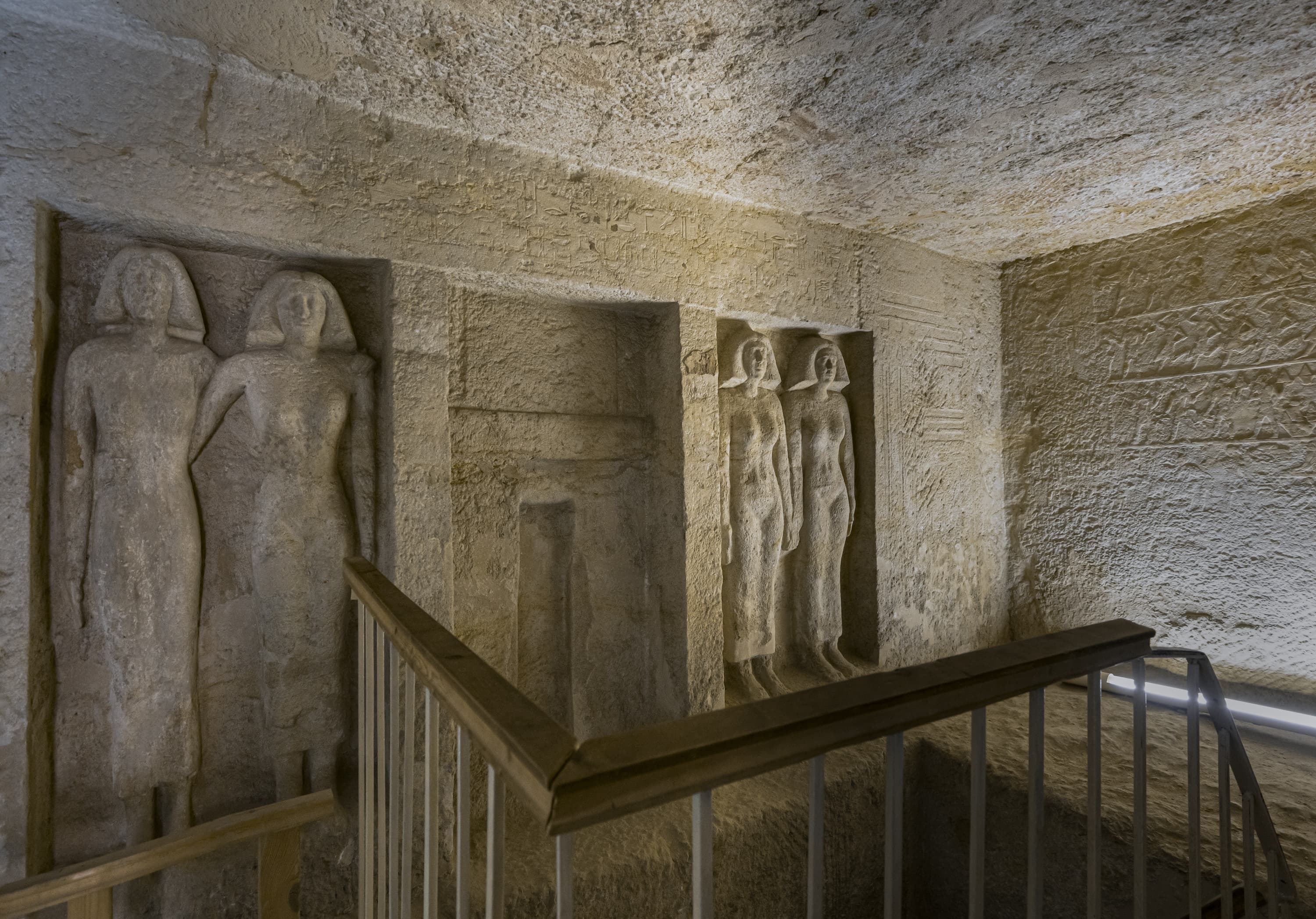 С двух сторон от ложной двери, предназначенной для прохождения сквозь нее ка усопшей, мастера вырезали из камня две пары статуй. В левой нише дочь обнимает мать за талию, а та ее за плечи, а в правой мать держит дочь за руку, как бы провожая в иной мир. Здесь установлена современная лестница (в древние времена ее, естественно, не было) для спуска в погребальную камеру, однако ничего интересно там нет: саркофаг Мересанх, дарованный ей матерью, и его содержимое в виде останков усопшей царицы хранятся теперь в Египетском музее в Каире.
