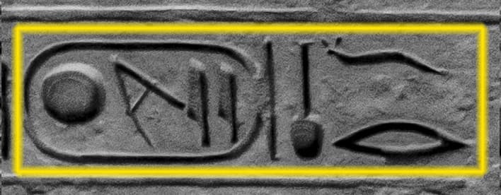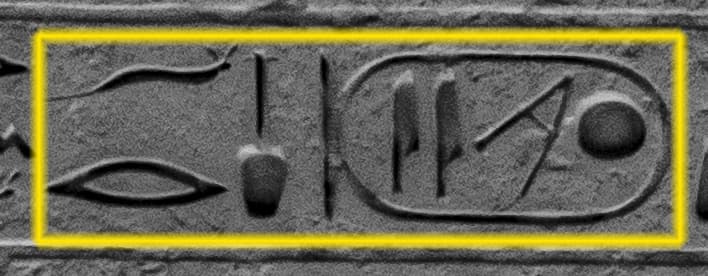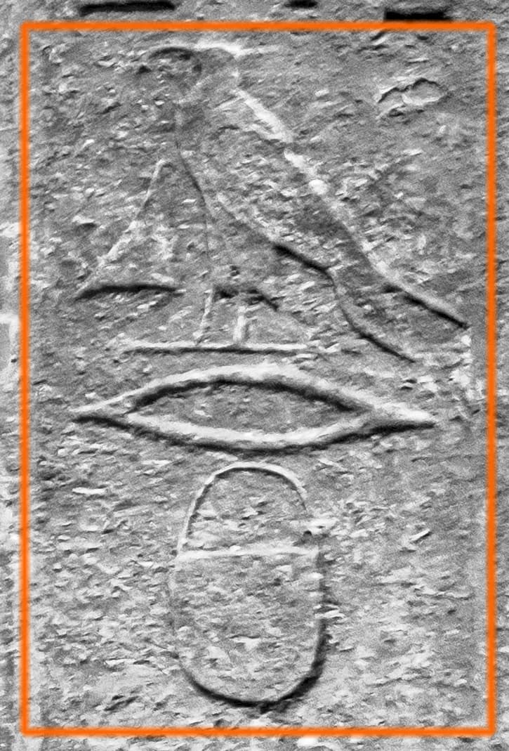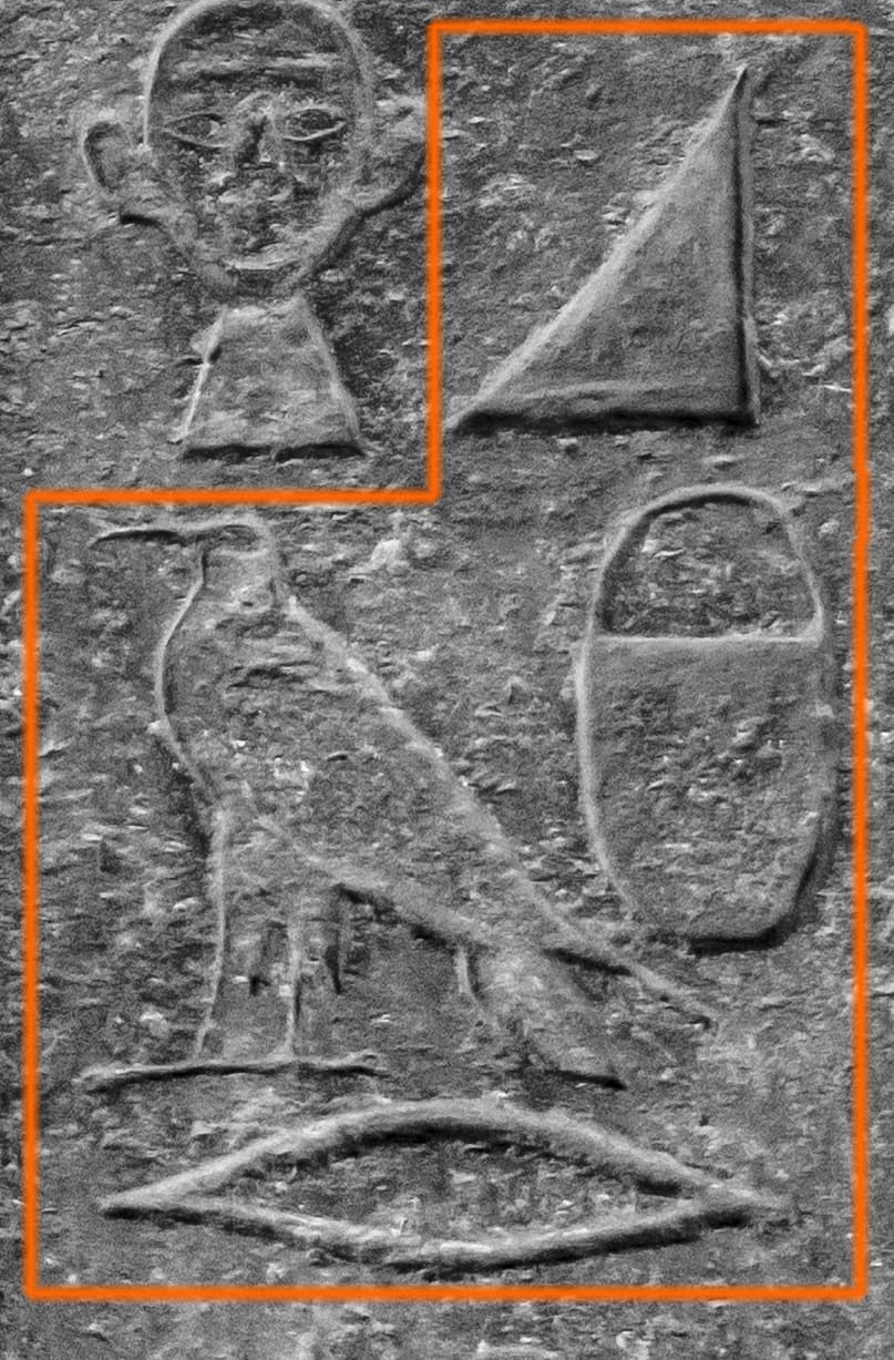 Имя фараона заключено в картуш, а три иероглифа, читающиеся как нфр (нефер — прекрасный, совершенный) расположены после него. Кстати, здесь мы видим распространенную во времена Древнего царства практику повторения иероглифов: нфр в аналогичном значении можно описать одним (первым) символом, который похож на струнный музыкальный инструмент или лопату (но на самом деле это сердце и верхние дыхательные пути). Однако в нашем случае к этому символу добавлены еще ф (рогатая змея) и р (рот). Наша привычка заставляет читать это как нефер-еф-ер, но последние два иероглифа представляют собой так называемые «фонетические дополнения», устраняющие двусмысленность при чтении записи.