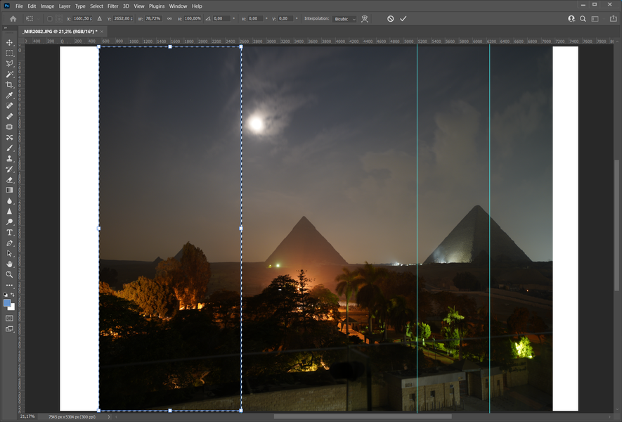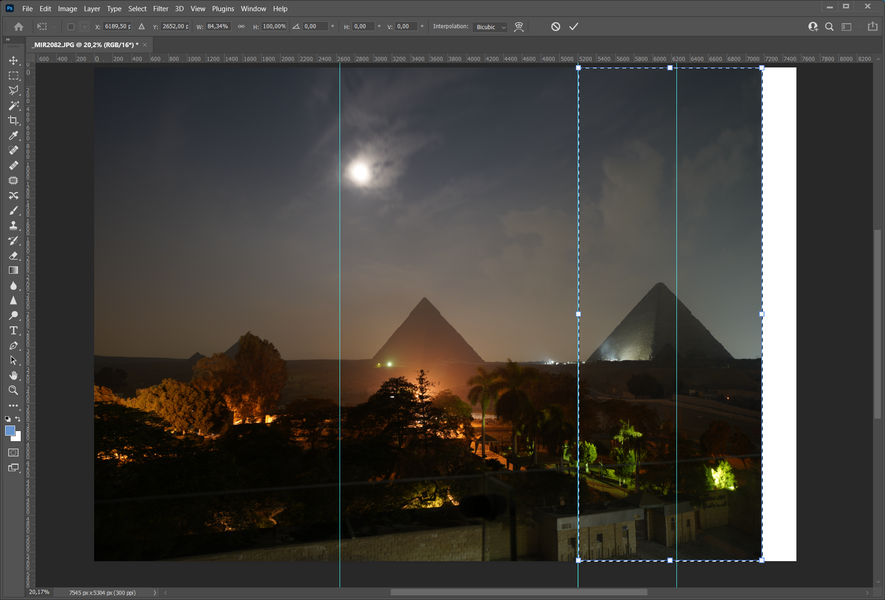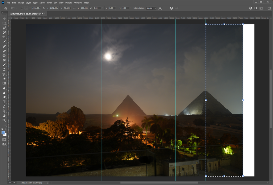Занявшись постобработкой в Adobe Photoshop, я разбил поле кадра на три зоны. Среднюю, условно правильную в смысле геометрии, оставил без изменений, а правую сжал по горизонтали, добившись примерно одинаковых углов боковых граней пирамиды Хуфу.