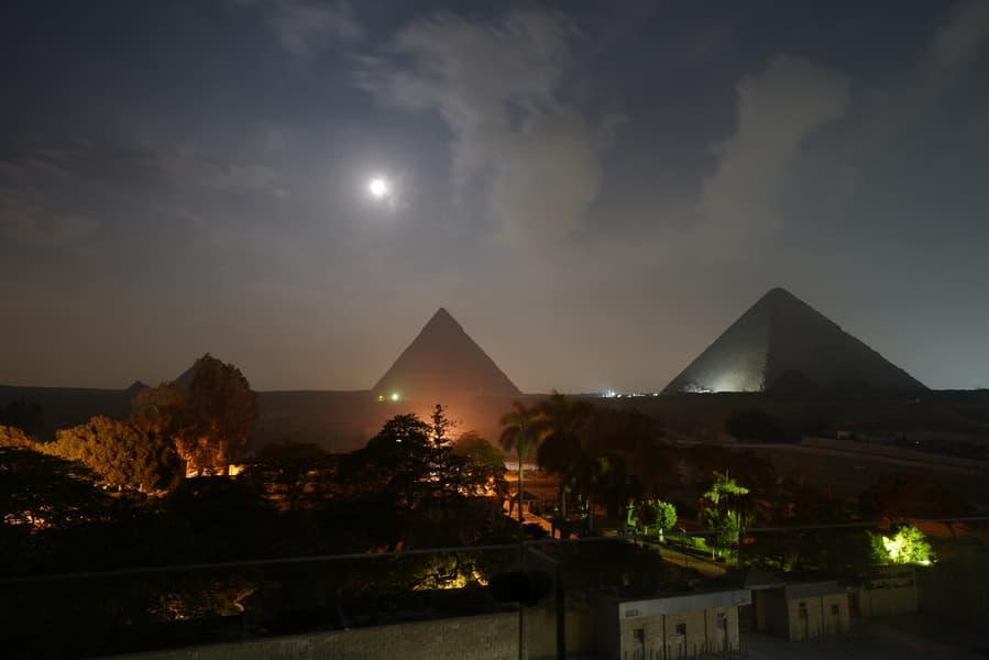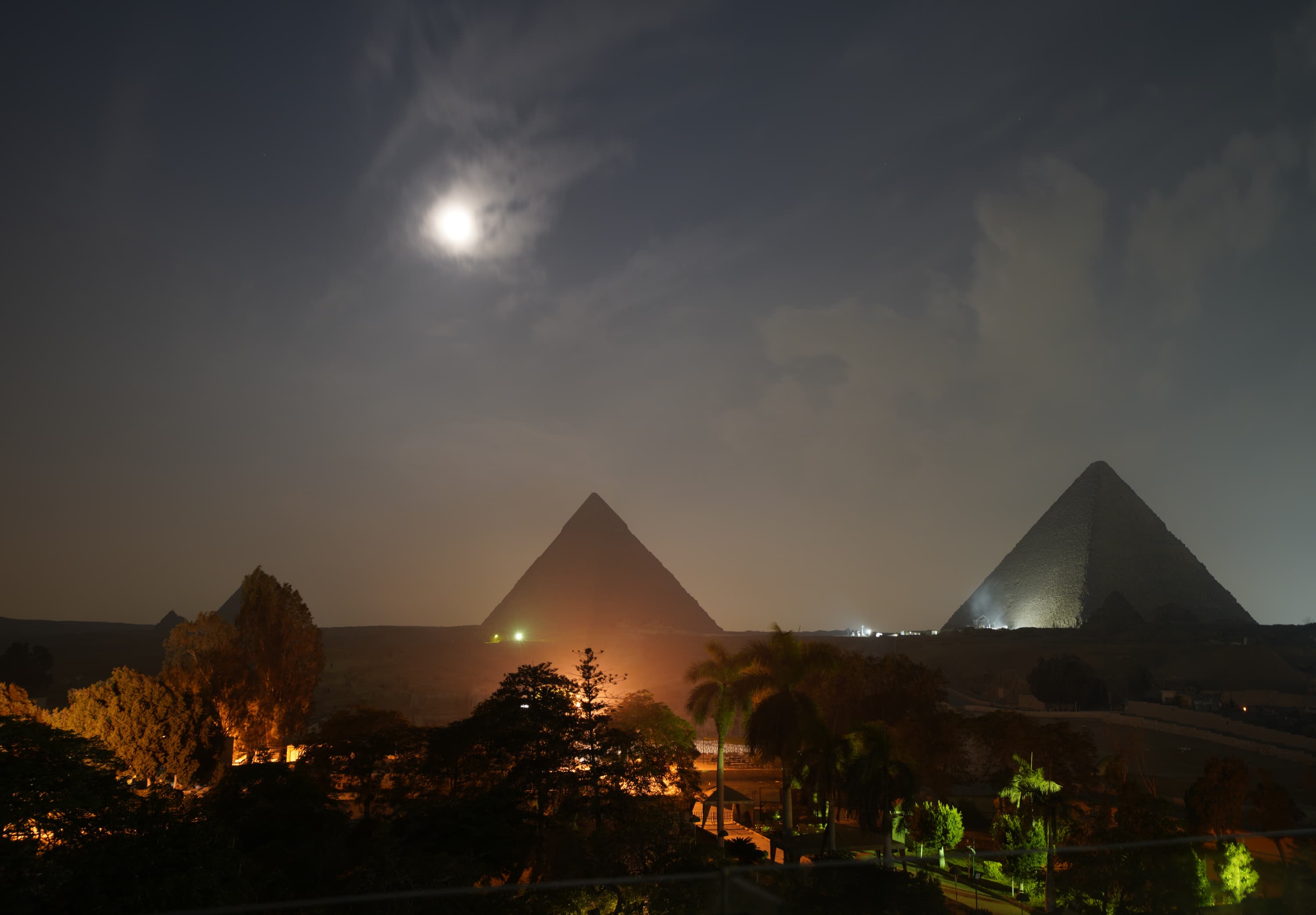 Сразу по приезде я вознамерился сделать впечатляющий снимок пирамид упомянутых царей и решил воспользоваться для этой цели сверхширокоугольным зумом Sony FE 12-24mm F4 G, поскольку был обречен использовать штатив. В ту ночь Луна проходила зенит около 02:30, а ее удачное в плане композиции (достаточно низкое) стояние над горизонтом на западе наблюдалось после 4 часов утра.