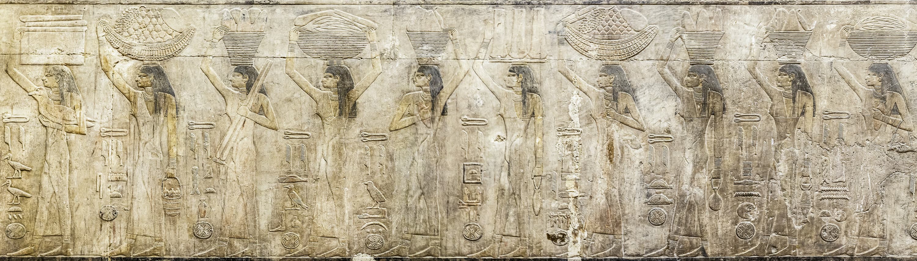 Кстати, о симметрии. Для древних египтян она была едва ли не важнейшим проявлением вселенского порядка маат, охранявшегося одноименной богиней законности и справедливости (с пером на голове). Следование симметрии проявлялось не только в архитектуре, но и в письменности, поэтому в зависимости от композиционных предпочтений иероглифы читаются и справа налево, и слева направо, располагаются то по горизонтали, то по вертикали. Рассмотрим стену вестибюля с двумя проемами.