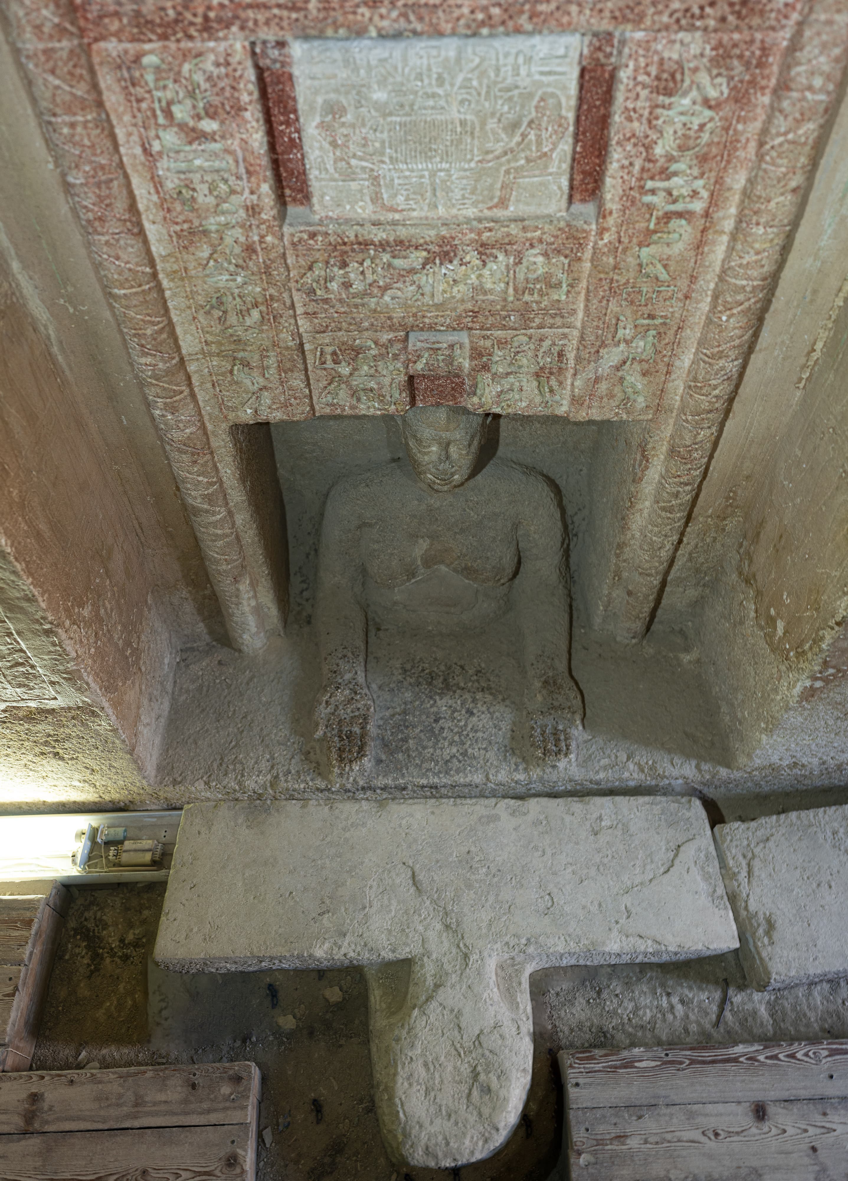 Наибольший интерес представляет статуя ка усопшего вельможи, которая словно вырастает из земли, положив на нее свои каменные руки ладонями вверх в ожидании приношений. При ФР 12 мм можно поставить камеру на пол, поместить в кадр необходимые подробности и сделать снимок, прикрыв диафрагму до F8, чтобы выиграть в глубине резкости.
