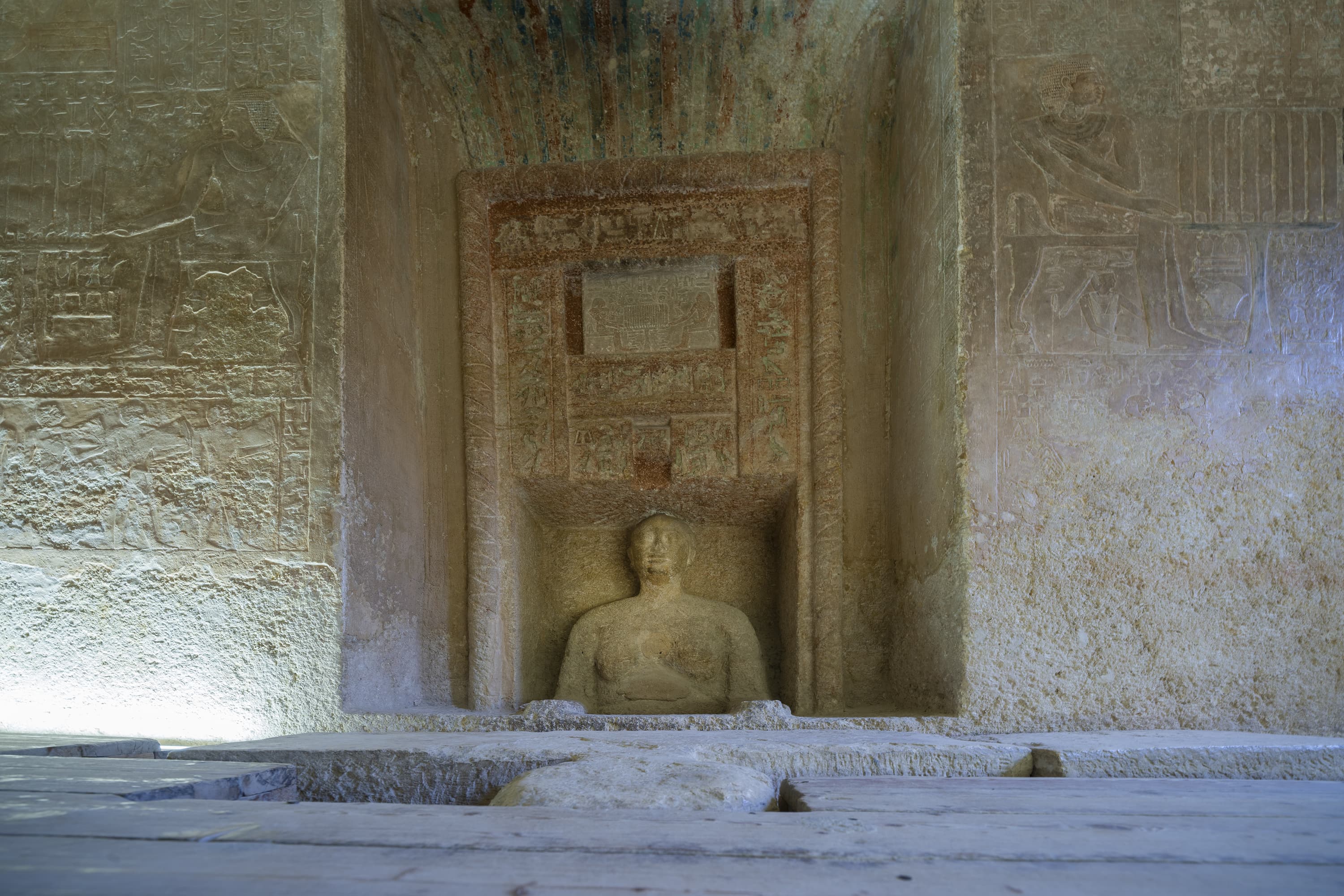 В усыпальнице Кар пространства больше, но сверхширокоугольная оптика все равно остается незаменимой. Без значительного угла обзора невозможно поместить в кадр все желаемые детали изображения, например статую усопшего (слева в нише), и одновременно сохранить симметричную композицию кадра — тот вид, которого добивались строители гробницы.