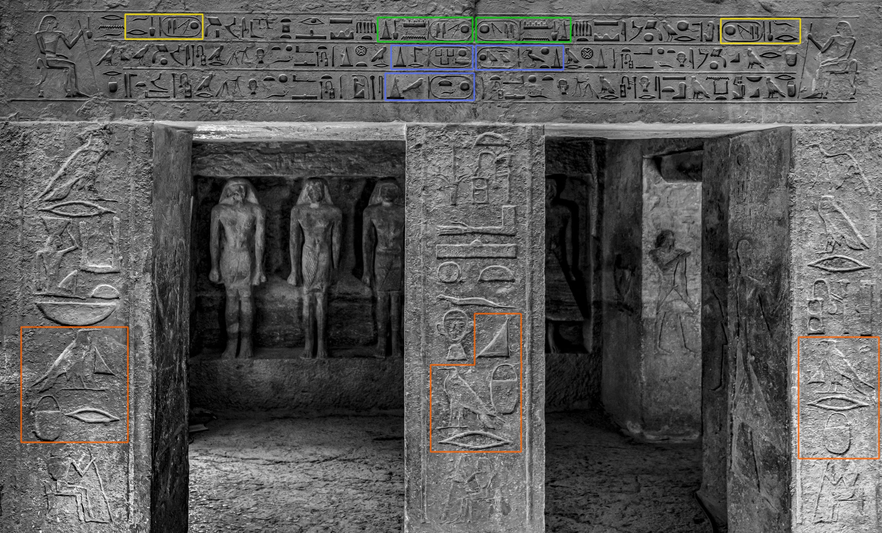В зеленых и синих рамках содержатся картуши с именами царей Хуфу, Хафра и Менкаура, а также символы пирамиды (треугольник на основании). Это описание должностей усопшего, в число которых входило управление работой припирамидных хозяйств соответствующих царских усыпальниц.
