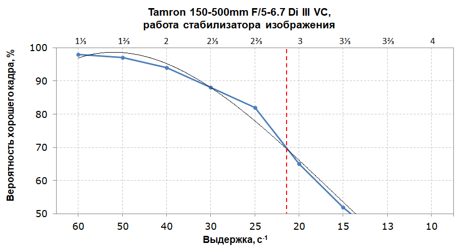 Производитель не заявляет конкретной эффективности стабилизатора. Наша методика позволяет оценить ее в 3 ступени экспозиции. Это не такой уж высокий результат для подобного объектива.
