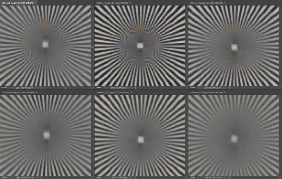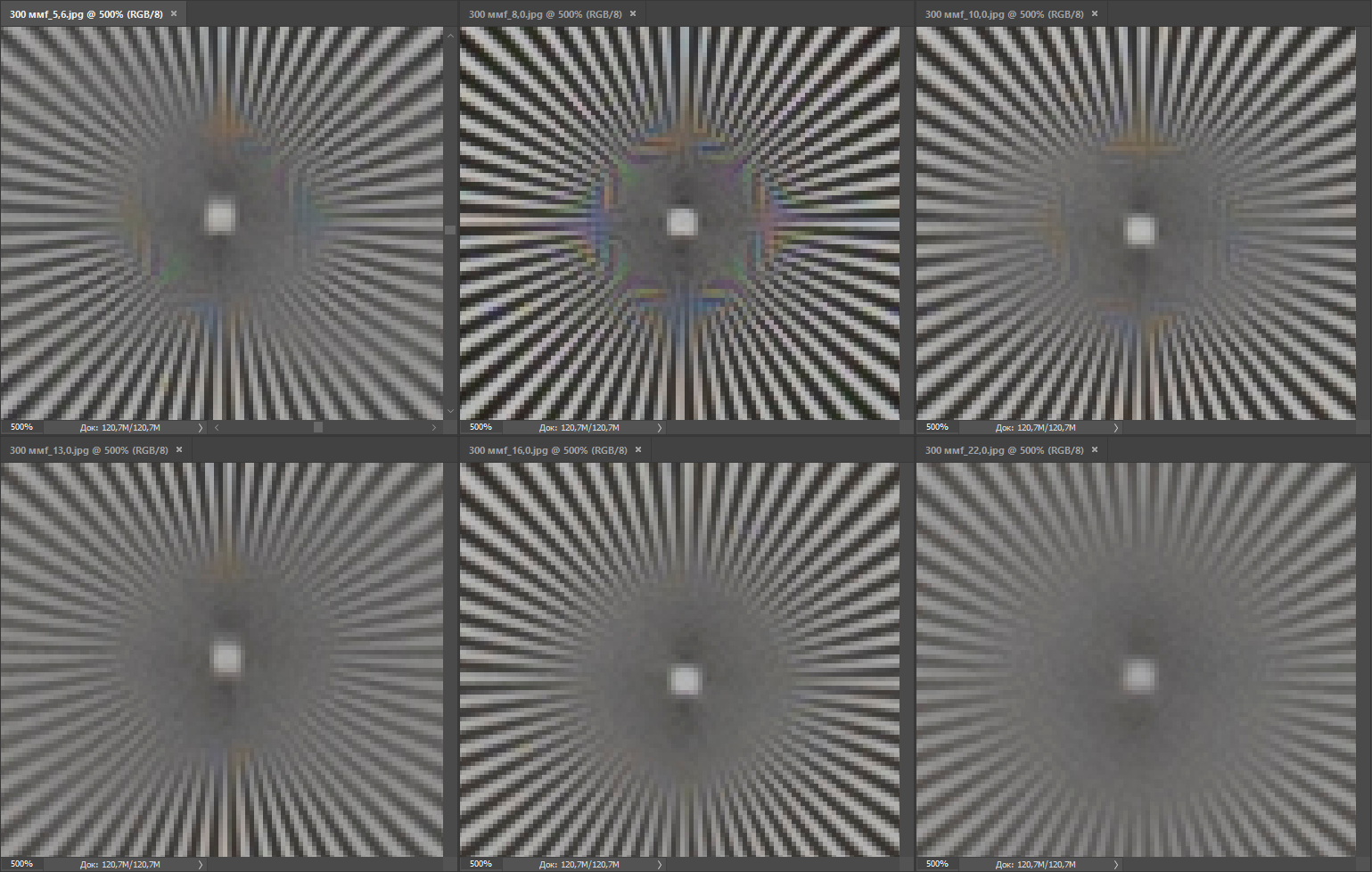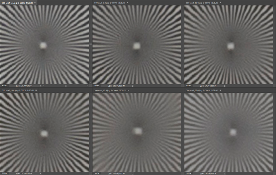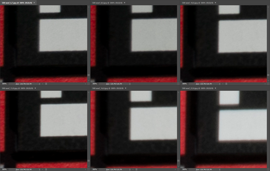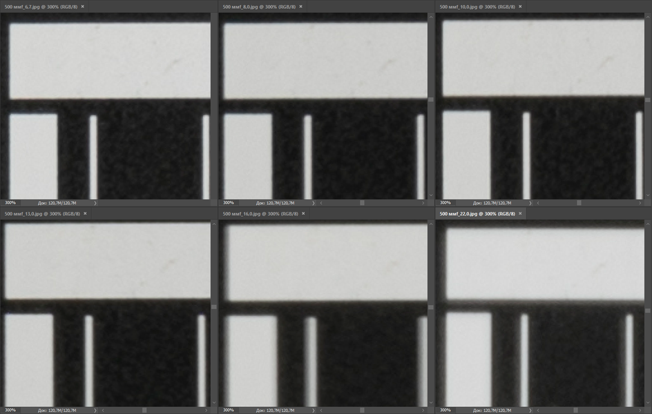При максимальном зумировании разрешающая способность понижается до 78% в центре и на краю при полном раскрытии. Дальнейшее диафрагмирование приводит к еще большему падению разрешения. В итоге реально рабочим на 500 мм можно назвать небольшой диапазон F6,7—F10.