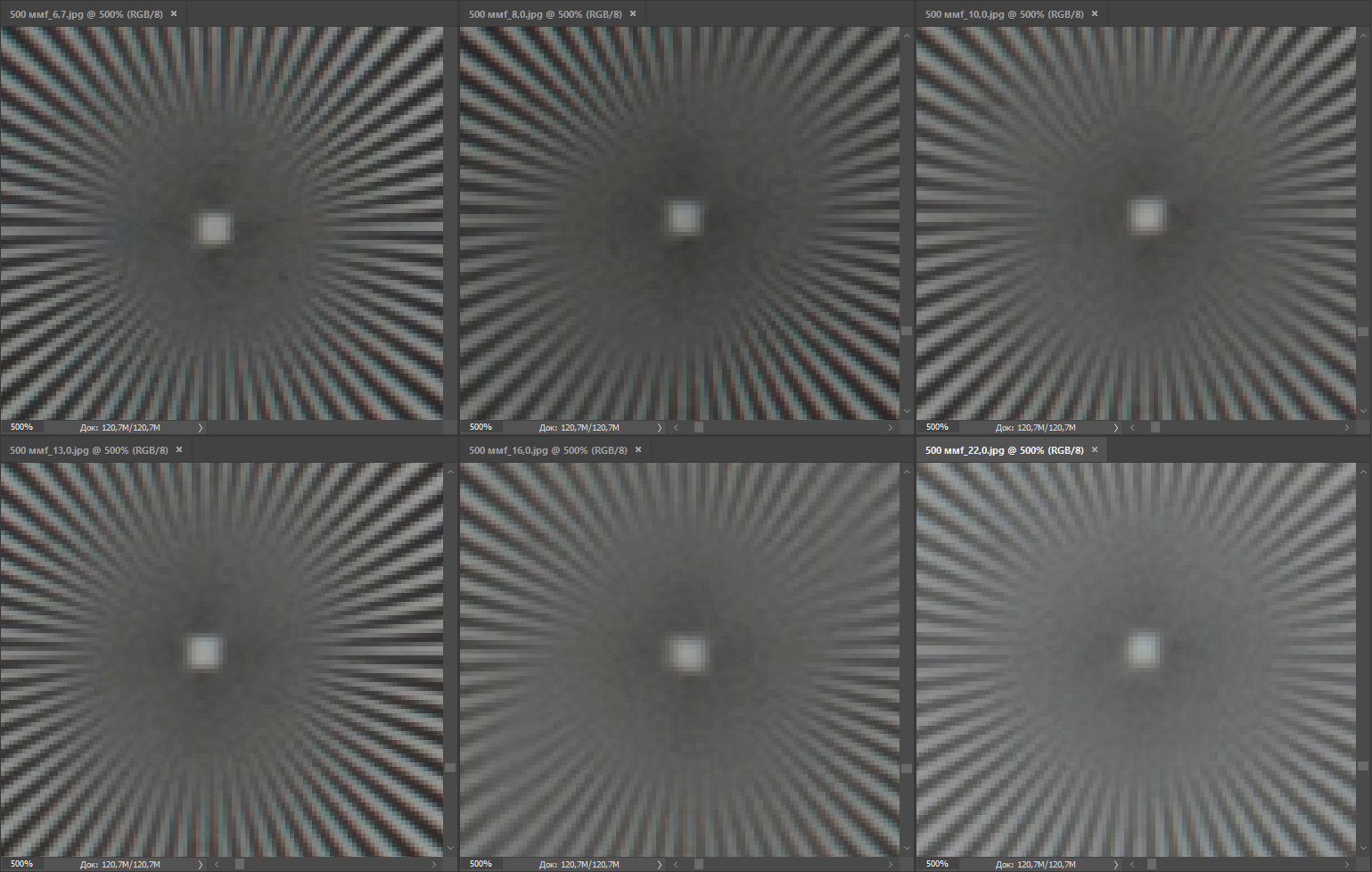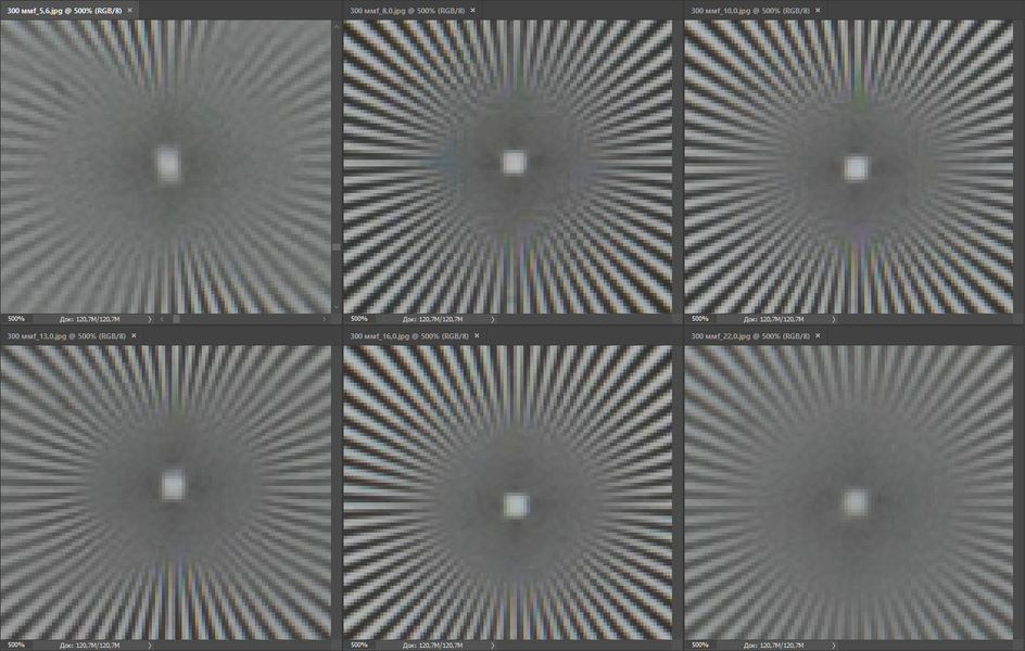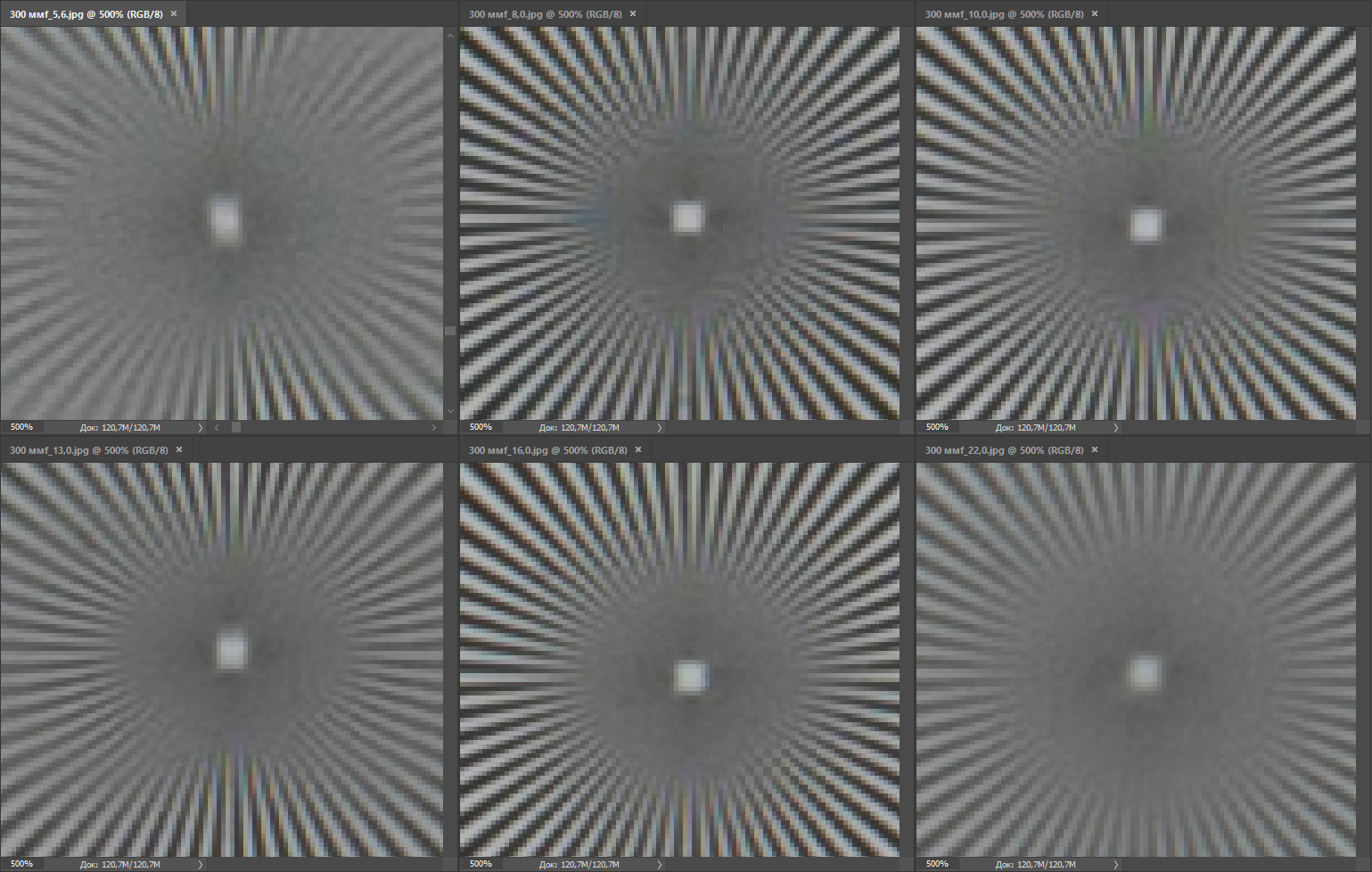При максимальном зумировании разрешающая способность понижается до 78% в центре и на краю при полном раскрытии. Дальнейшее диафрагмирование приводит к еще большему падению разрешения. В итоге реально рабочим на 500 мм можно назвать небольшой диапазон F6,7—F10.