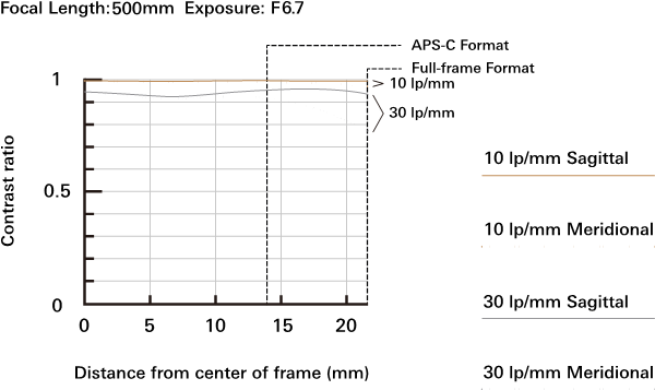 Производитель приводит кривые частотно-контрастной характеристики (ЧКХ) Tamron 150-500mm F5-6.7 Di III VC VXD. Напомним, что в идеальной ситуации они должны располагаться параллельно оси абсцисс на максимальной высоте и не содержать провалов и пиков.