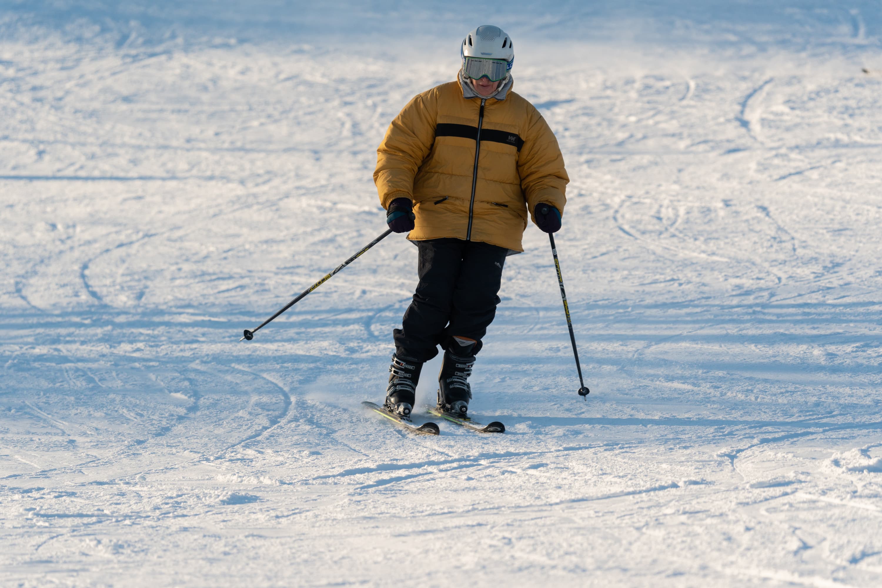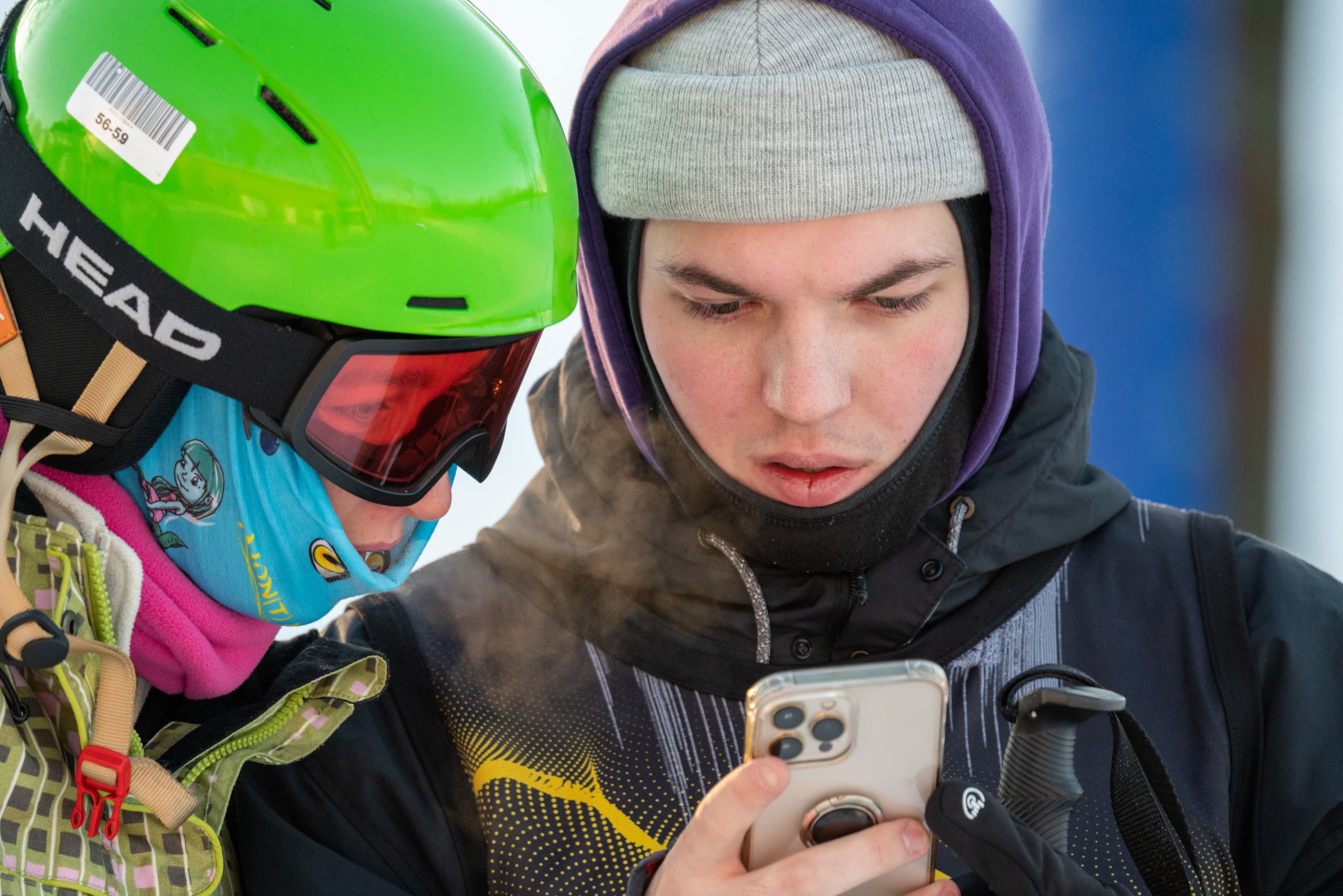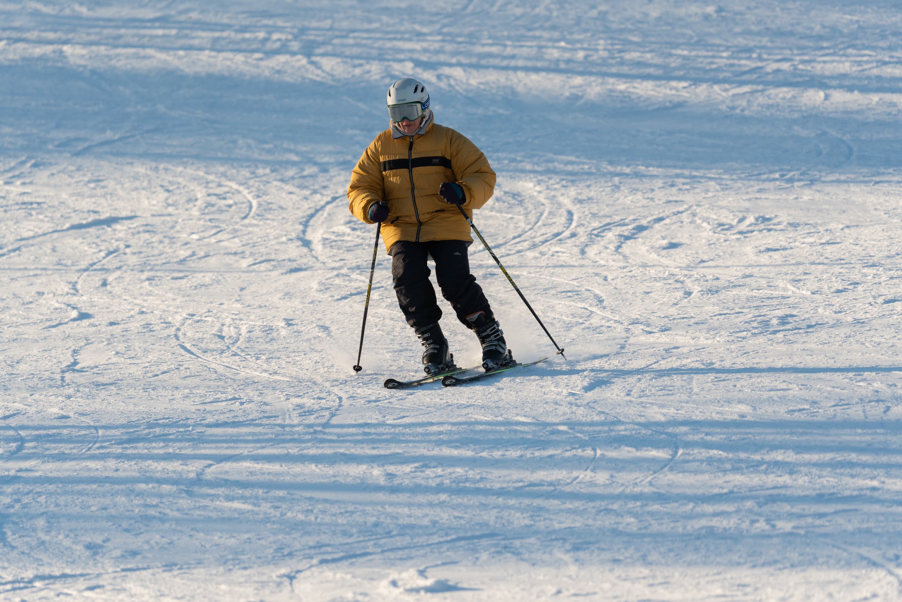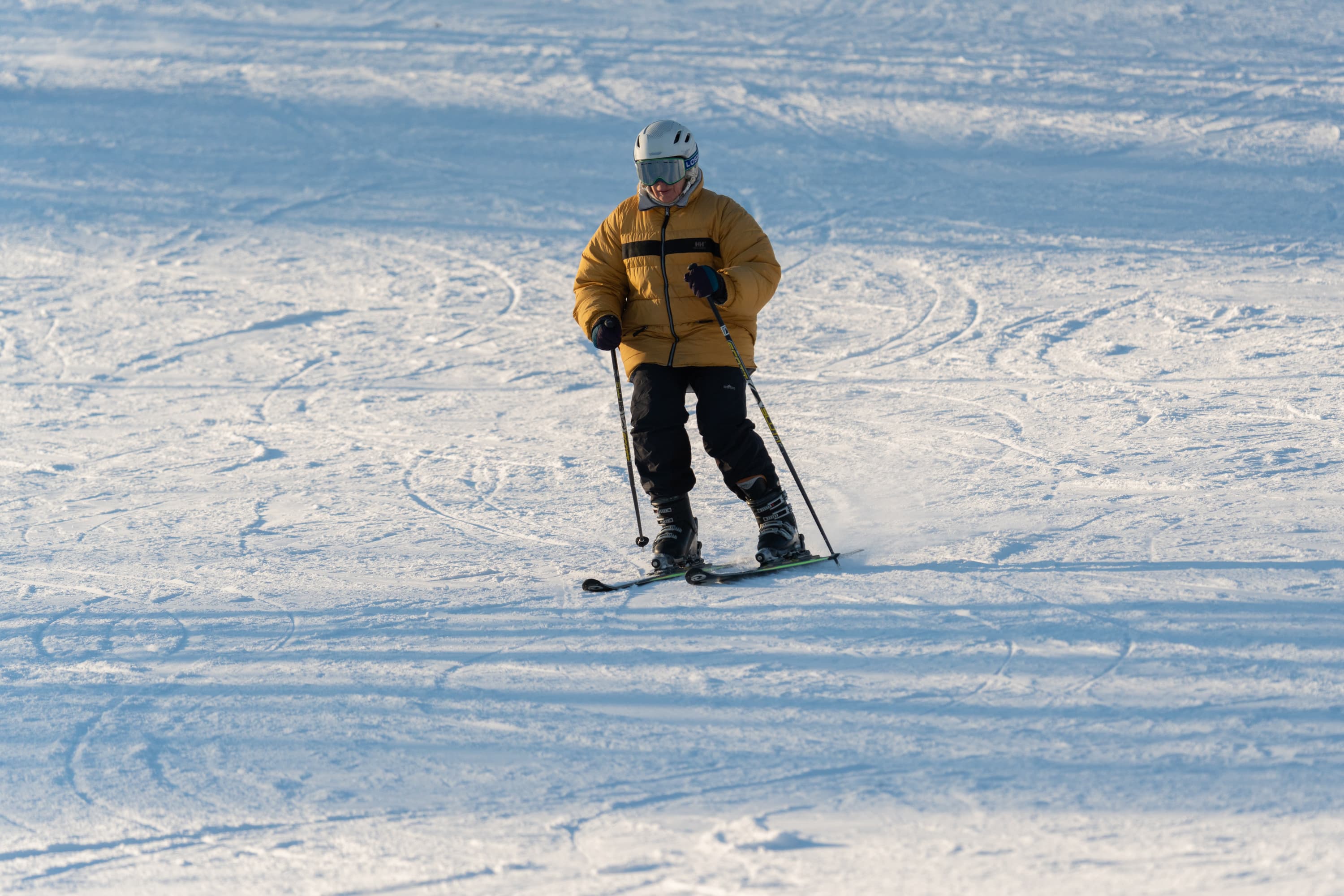В динамичных сюжетах активация непрерывной автофокусировки (AF-C) позволяет объективу работать практически без брака. Серия из 9 кадров, представленных ниже, представляет собой сочетание трех последовательностей фиксации горнолыжного спуска. Вначале мы нажимали кнопку спуска затвора до половины, а затем трижды нажимали ее до конца. Одновременно перекомпоновывали кадр и снимали фигуру лыжника с проводкой вправо и влево.