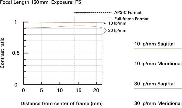 Картина MTF при максимальном и минимальном ФР очень привлекательная, даже при разрешении меридиональных структур 30 линий/мм. Важно, что разрешающая способность очень стабильна: от центра к периферии она изменяется незначительно.