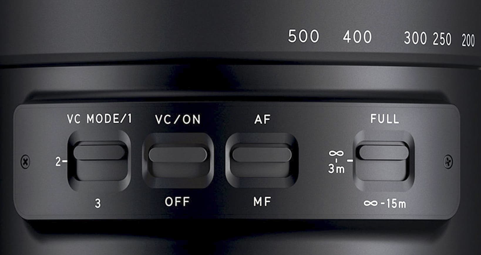 На значительном возвышении над боковой поверхностью тубуса располагаются механические переключатели режима работы стабилизатора изображения, его включения и выключения, переключатель фокусировки (автомат/ручная) и ограничитель диапазона работы АФ (полный, от 3 м до бесконечности и от 15 м до бесконечности).