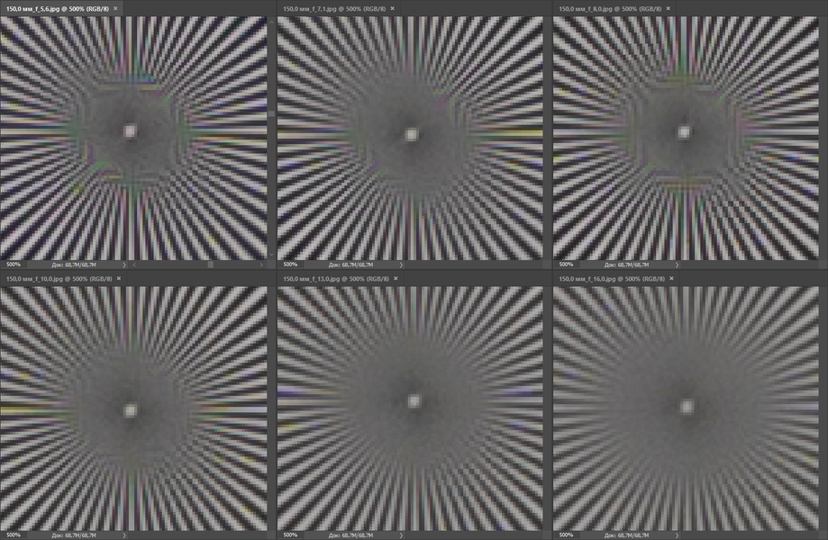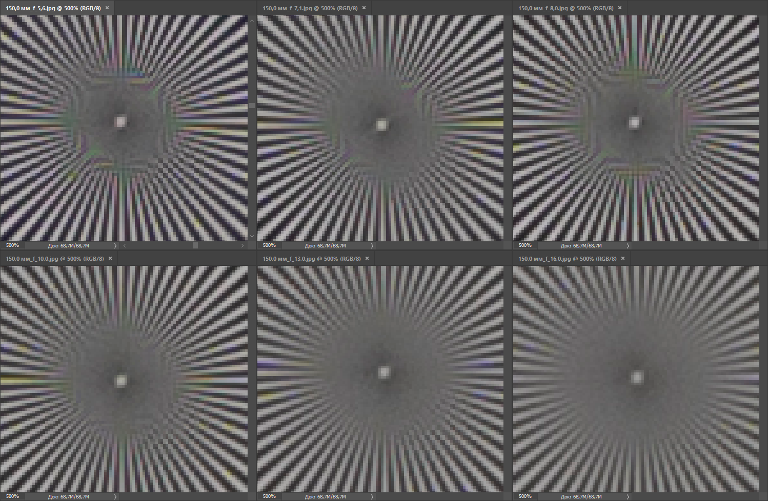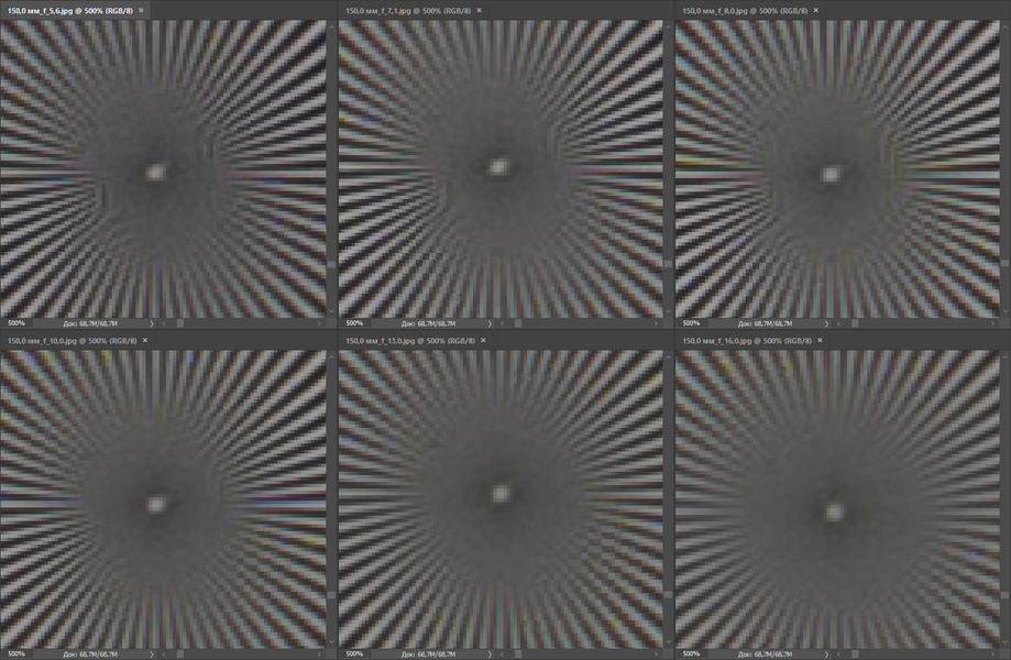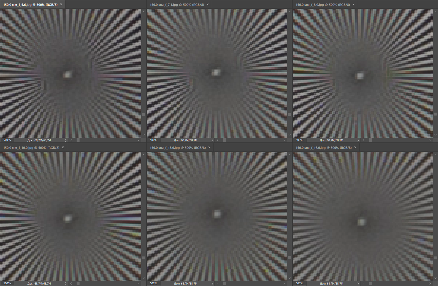 Как ни странно, признаки лучистости определяются уже при максимальном и субмаксимальном раскрытии, однако по-настоящему картину следует оценивать при F5,6 и меньшем относительном отверстии. Заметим, что картинка формирует традиционную для семилепестковой диафрагмы 14-лучевую корону лишь при F22, а в ряду F5,6—F8—F11—F16 их форма меняется, представляя собой разные варианты удвоения лучей. Впрочем, эти структуры оказываются достаточно удачными. Иное дело — паразитные рефлексы с поверхностей линз, которые появляются уже при F4 и далее умножаются и усиливаются.