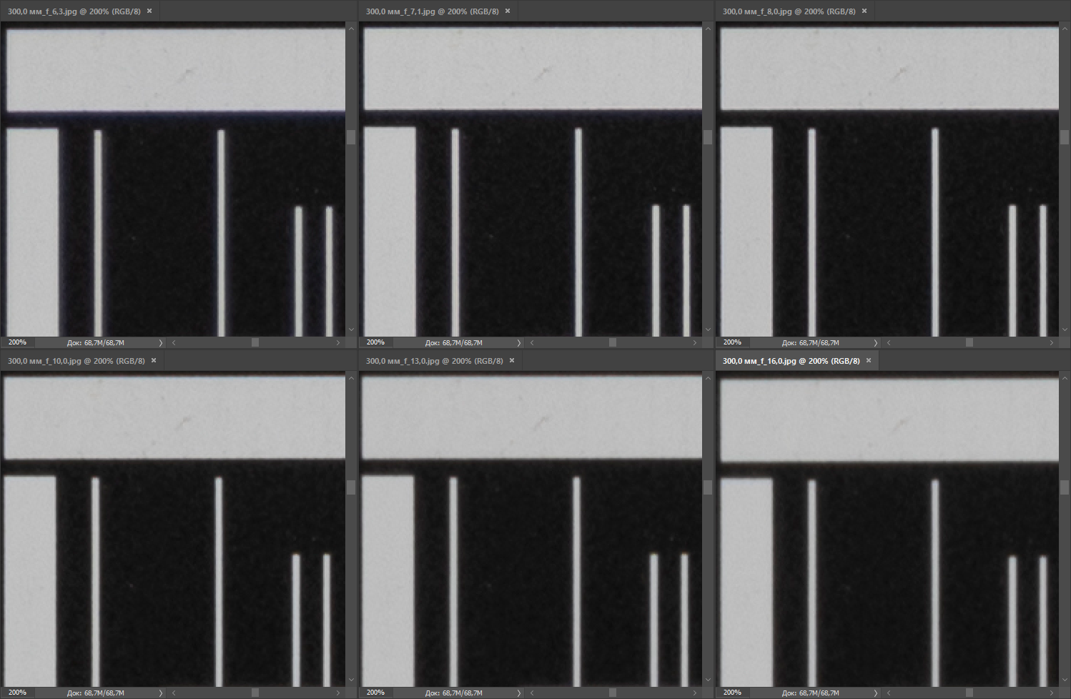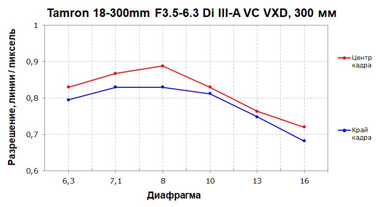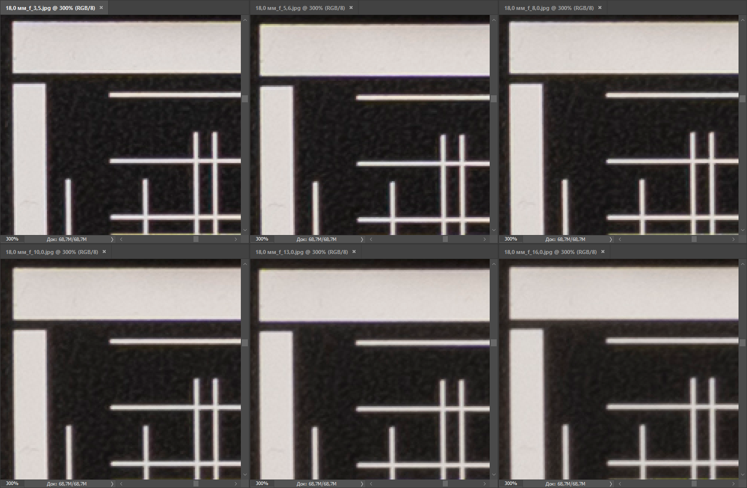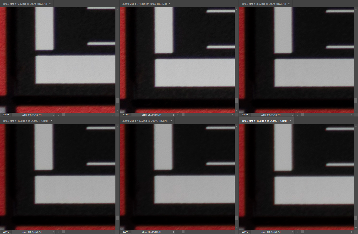 При ФР 18, 100 и 200 мм высокая резкость в центре достигается уже при максимальном раскрытии. При этом начиная с ⅓ расстояния от центра к периферии заметно существенное снижение резкости, а в максимально удаленных углах детали размываются очень сильно. Диафрагмирование до F8 позволяет существенно улучшить ситуацию на периферии, но даже при F11 резкость на краях не может сравняться с резкостью в центре. При F16—F22 резкость вновь ухудшается из-за дифракции. При ФР 300 мм при максимальном раскрытии (F6,3) резкость страдает уже и в центре кадра. Для получения удовлетворительного результата объектив следует диафрагмировать до F11.