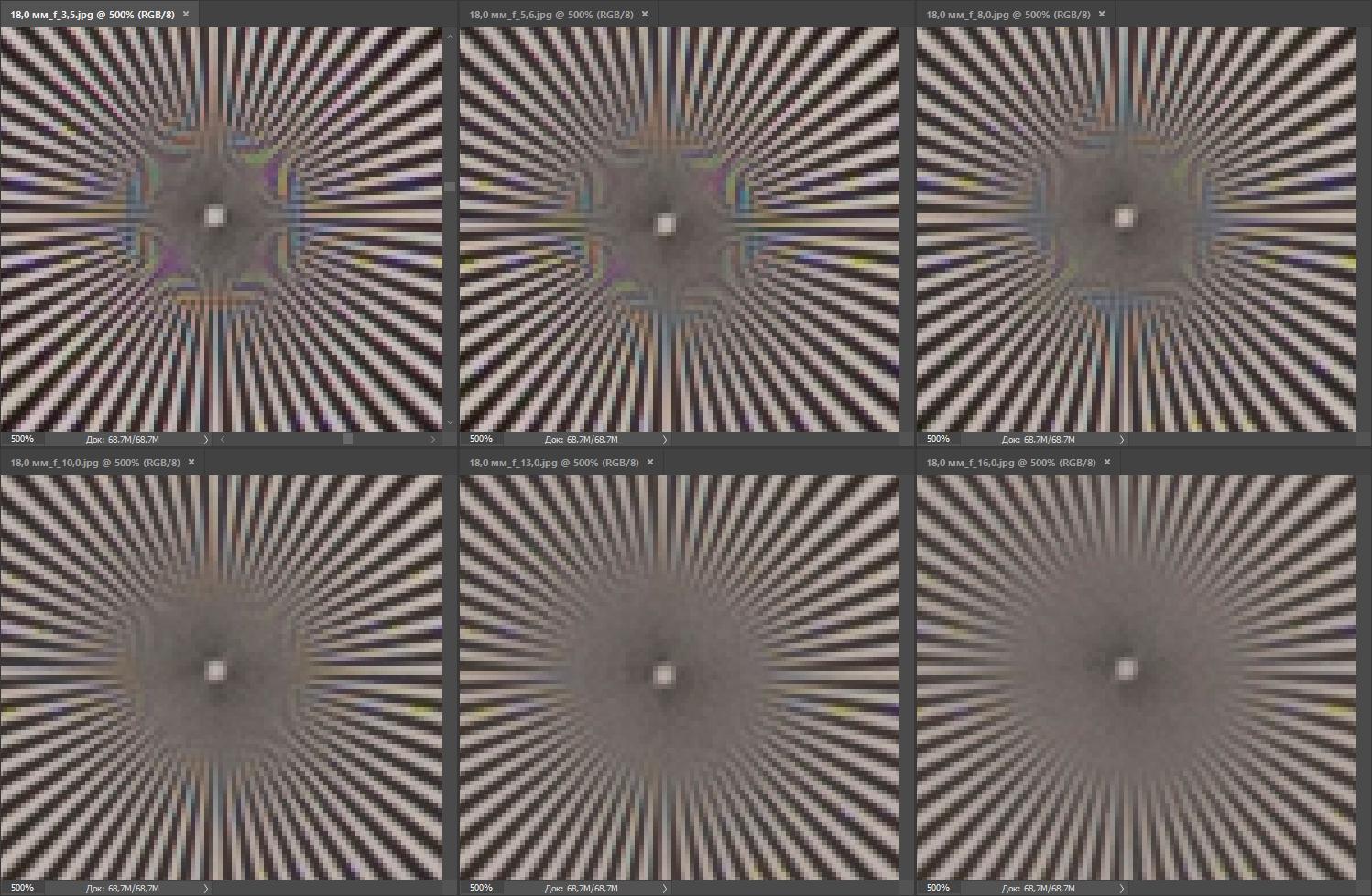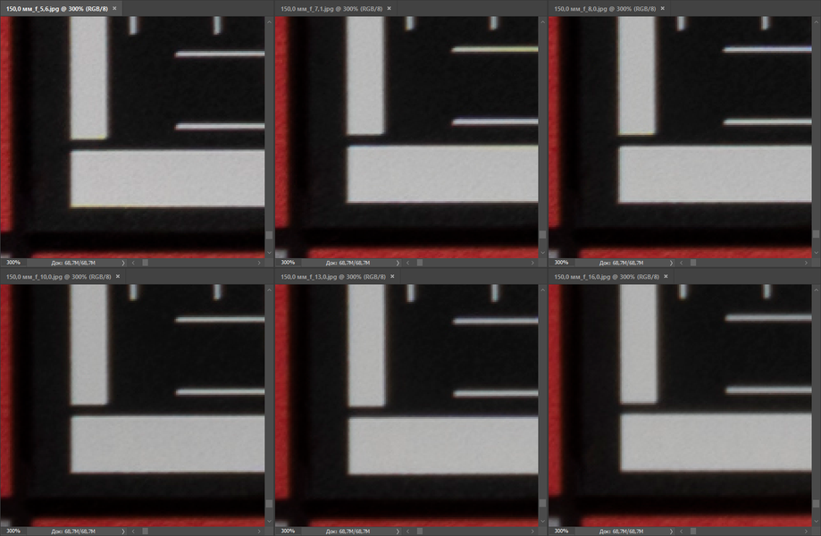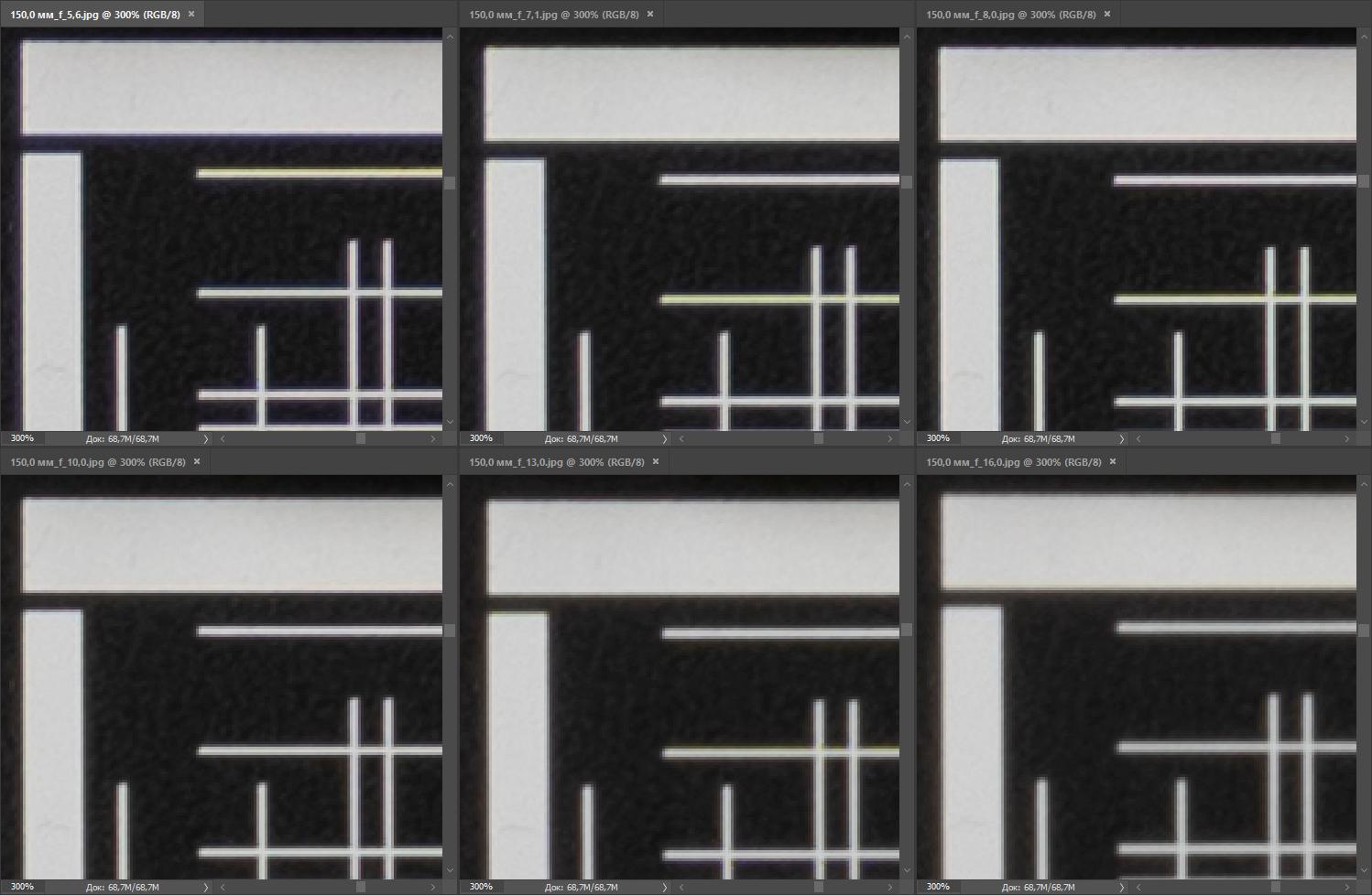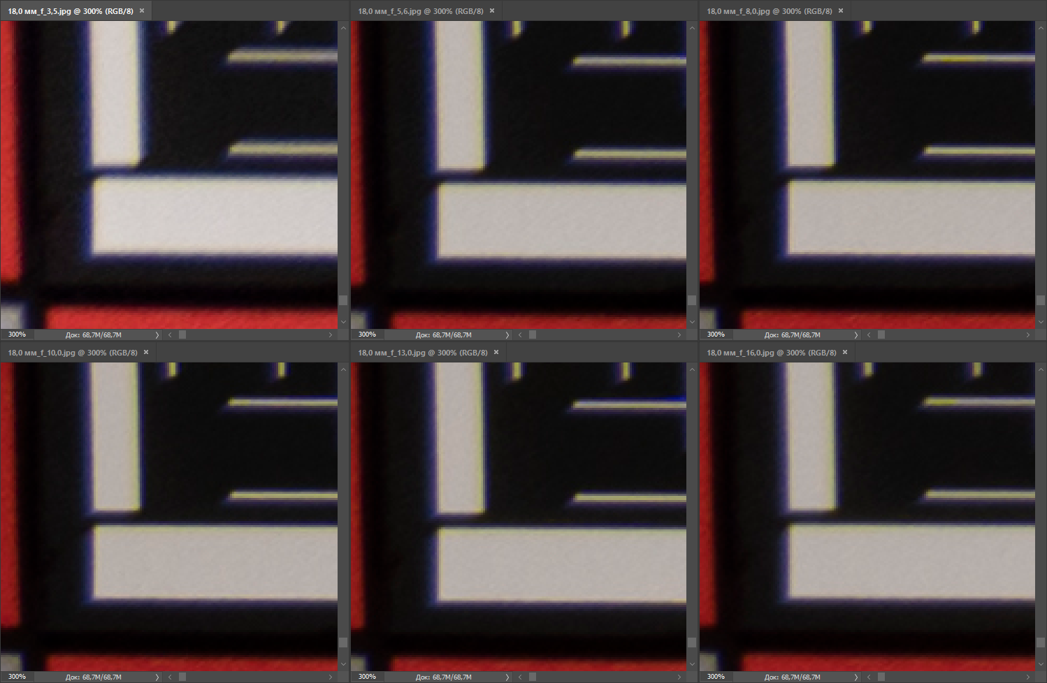 При ФР 18, 100 и 200 мм высокая резкость в центре достигается уже при максимальном раскрытии. При этом начиная с ⅓ расстояния от центра к периферии заметно существенное снижение резкости, а в максимально удаленных углах детали размываются очень сильно. Диафрагмирование до F8 позволяет существенно улучшить ситуацию на периферии, но даже при F11 резкость на краях не может сравняться с резкостью в центре. При F16—F22 резкость вновь ухудшается из-за дифракции. При ФР 300 мм при максимальном раскрытии (F6,3) резкость страдает уже и в центре кадра. Для получения удовлетворительного результата объектив следует диафрагмировать до F11.