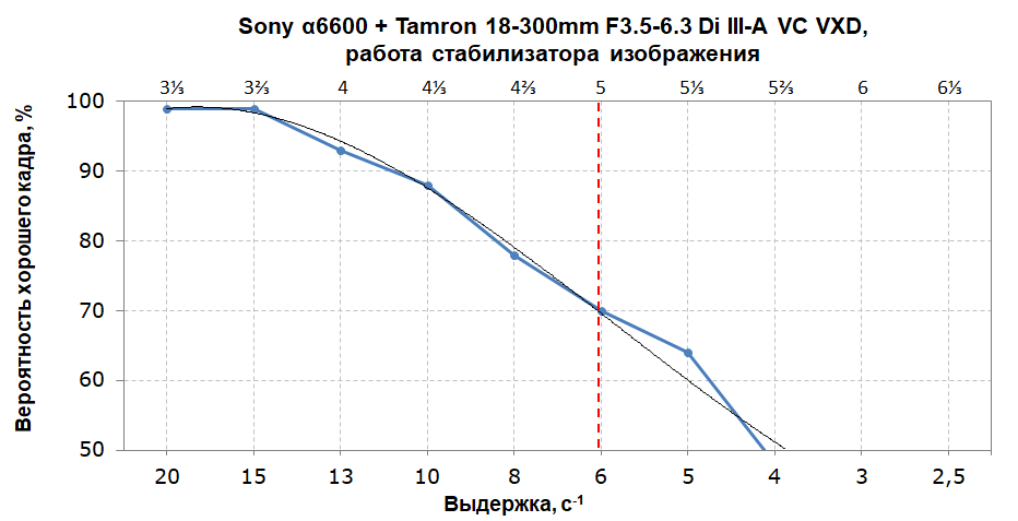 Производитель заявляет только наличие стабилизатора, но не его эффективность. Наша методика позволяет оценить эффективность стабилизации в 5 ступеней экспозиции — это достаточно высокий экспериментально подтвержденный, а не декларированный показатель.