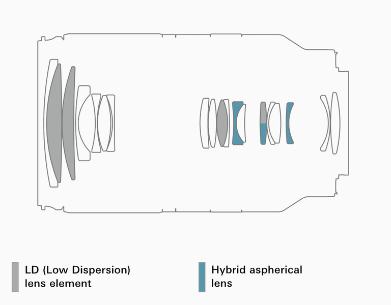 Конструкция объектива весьма сложная. Она объединяет 19 линз в 15 группах, включая 4 низкодисперсионных (Low Dispresion, LD) и 3 асферических. Первые помогают увеличить резкостные характеристики оптики за счет подавления сферических аберраций, а вторые — бороться с традиционной хроматикой, свойственной классическим линзам. Асферические элементы не цельностеклянные, а гибридные, то есть представляют собой комбинацию из традиционного стекла и дополняющего наружного полимерного слоя. Подобная конструкция позволяет значительно удешевить и ускорить изготовление асферических линз. Заметим, что недоверчивое отношение фотообщественности к полимерным оптическим элементам вообще и к гибридным в частности нельзя считать оправданным. Такие линзы широко используются в современной оптике, причем даже в объективах премиального класса, и часто в безальтернативном варианте.