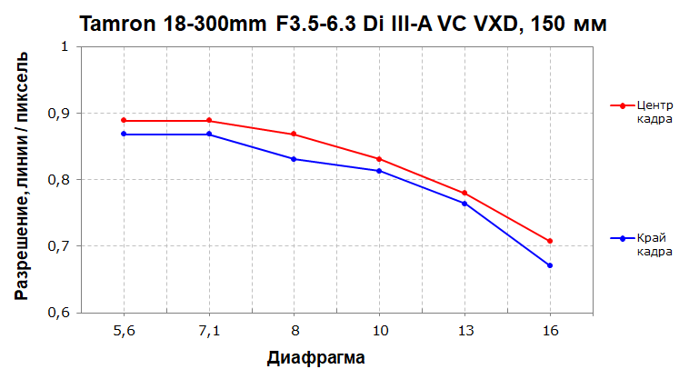 В широкоугольном положении разрешающая способность объектива достаточно высокая для подобного гиперзума, но начиная с f/10 она быстро падает. Разброс разрешающей способности по полю кадра более 5%, но в среднем показатели остаточно высокие.