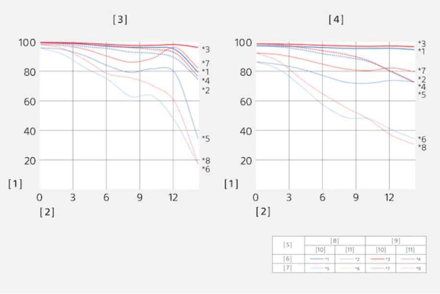 Обозначения: 1 — контрастность (%); 2 — расстояние от центра кадра (мм); 3 — при ФР 18 мм; 4 — при ФР 200 мм; 5 — пространственная частота; 6 — для 10 пар линий/мм; 7 — для 30 пар линий/мм; 8 — при максимальном раскрытии; 9 — при диафрагме F8; 10 — для сагиттальных структур; 11 — для меридиональных структур.