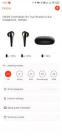 Устанавливаем ПО, даем необходимые для работы разрешения. Гарнитуру, как уже упоминалось выше, сопрягаем заранее. После запуска приложение пару секунд тратит на подключение, после чего на главном экране можно увидеть зарядку обоих наушников и кейса, причем всех по отдельности. Ну а ниже расположено меню, в верхней части которого находится переключатель режимов работы шумоподавления и «режима прозрачности».