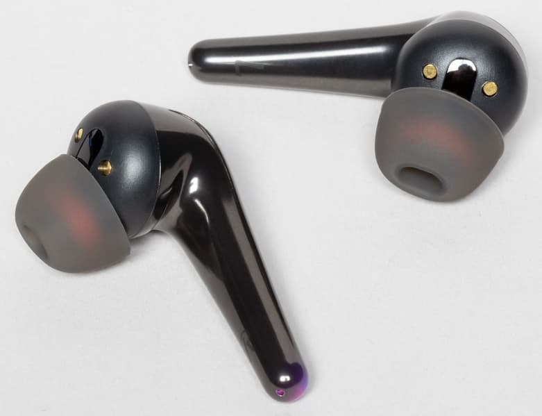 Наушники выполнены из глянцевого пластика, про светодиодные индикаторы в нижней части палочек мы уже упоминали. В ярком студийном свете они выглядят скромно, в жизни же смотрятся очень эффектно.