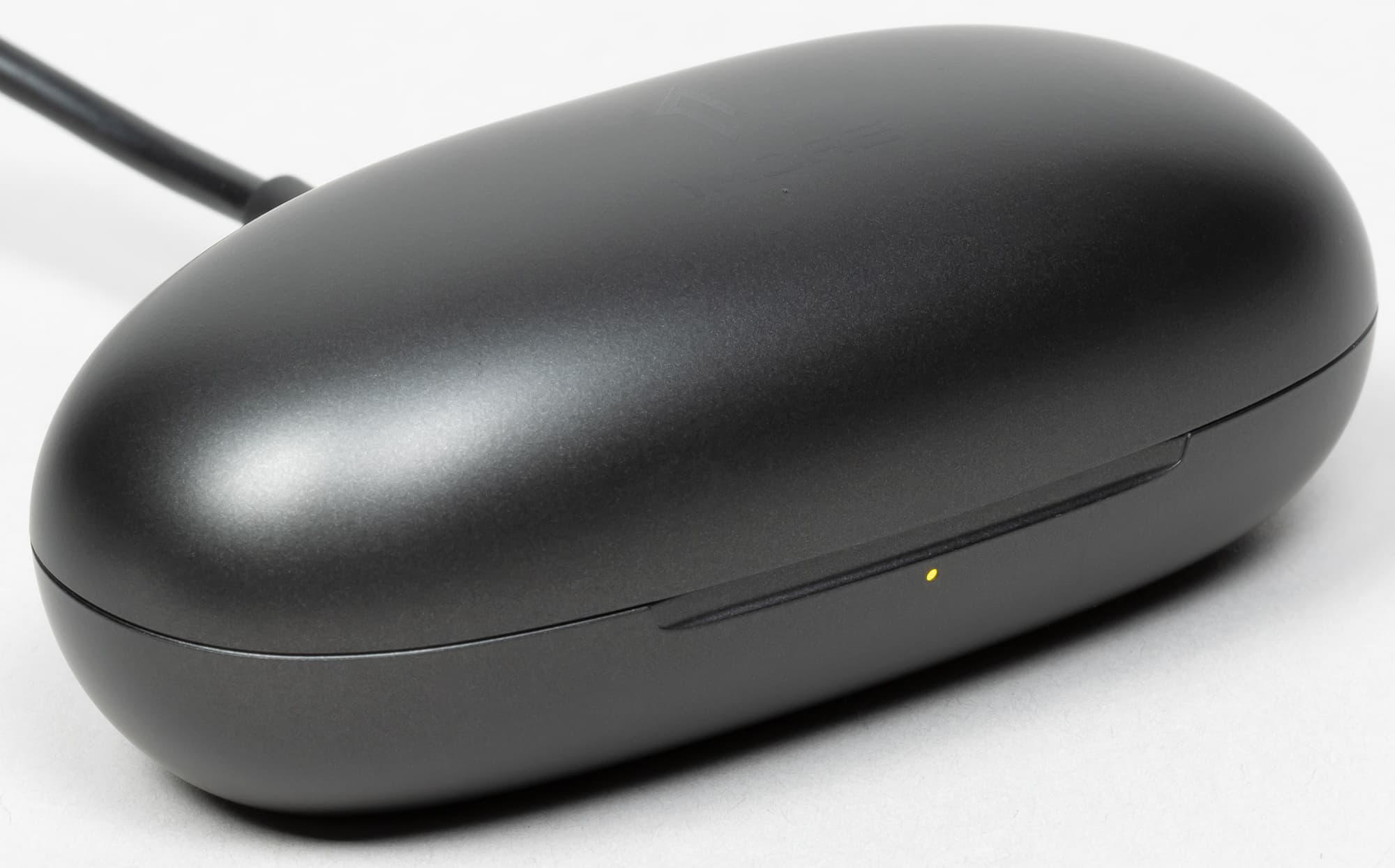 Слоты глянцевые, внутри видны подпружиненные контакты для зарядки и обозначения «правый»/«левый». Перед ними размещена небольшая кнопка, при долгом нажатии принудительно запускающая процесс Bluetooth-сопряжения ComfoBuds Pro с новым устройством.