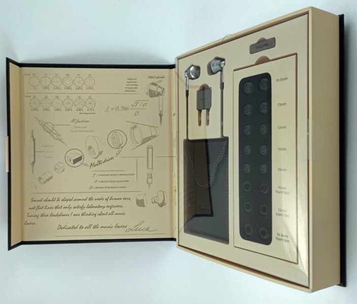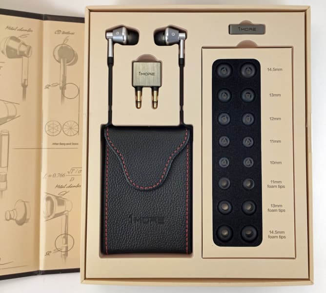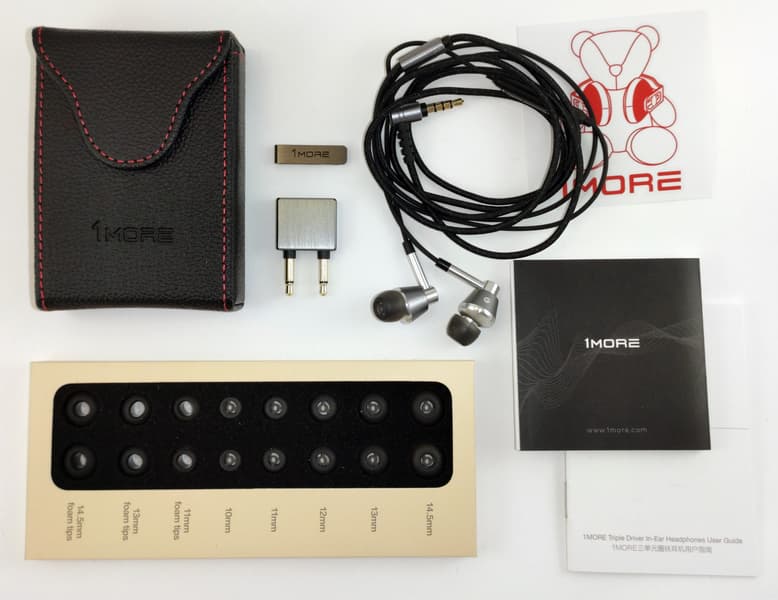 В комплект входят сами наушники, 8 пар дополнительных амбушюров, кейс для хранения и переноски, адаптер для самолета и клипса для крепления кабеля к одежде.