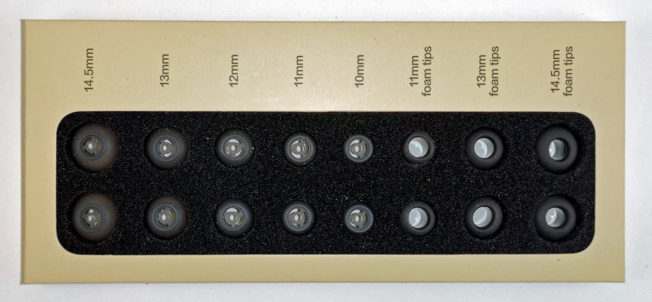 В комплект помимо предустановленных входит 8 пар сменных амбушюров — 5 силиконовых и 3 из пенистого материала. Отверстие силиконовых дополнительно защищено небольшой «решеткой», предотвращающей засорение сетки звуковода.