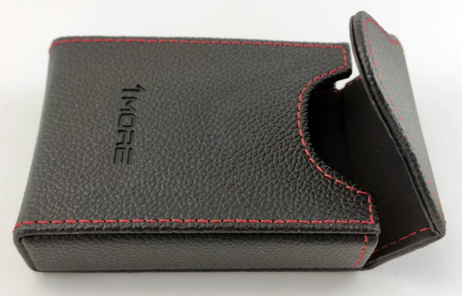 Кейс довольно большой — 9,5×7×2,5 см, в него помещаются не только сами наушники, но и компактный внешний ЦАП, например. Сделан он из очень качественной на вид искусственной кожи, по внешнему краю прошит красной нитью. Как и сами наушники, выглядит он весьма «премиально». Внутренняя поверхность бархатистая, клапан надежно удерживается в закрытом положении с помощью магнита.