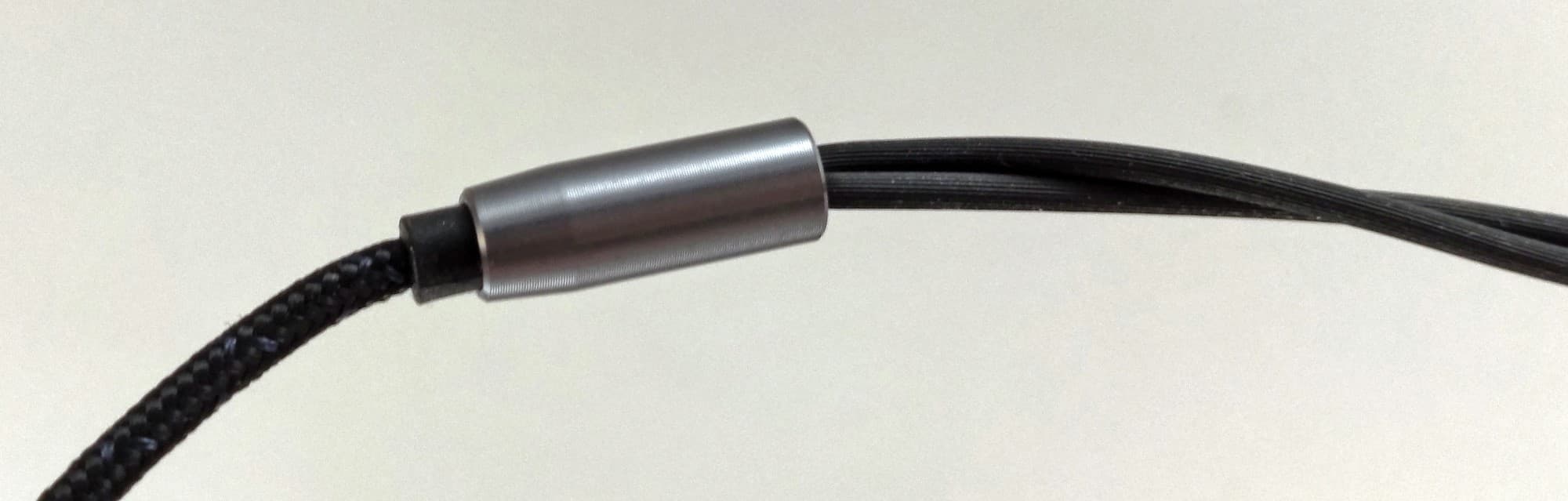 Кабель наушников имеет длину 130 см. Большая его часть покрыта прочной тканевой оплеткой. К надежности вопросов нет, а вот к «самозапутыванию» он весьма склонен. Часть возле наушников имеет силиконовую оплетку — для большей гибкости. Место разделения кабеля укреплено металлическим элементом.
