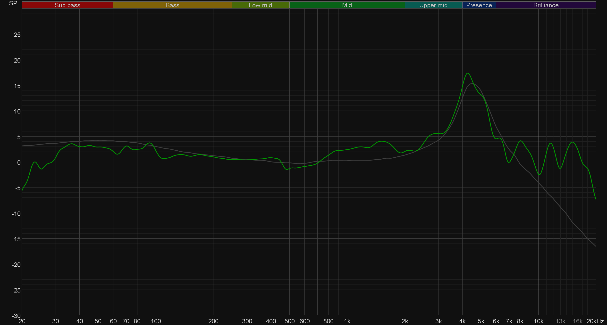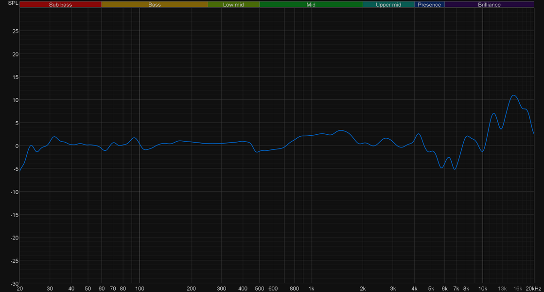График АЧХ показан на фоне целевой кривой, предоставленной производителем используемого стенда. Она является адаптированным под конкретное устройство аналогом так называемой «кривой Хармана», созданной командой Harman International под руководством доктора Шона Олива. Люди неодинаково воспринимают звук разной частоты, поэтому даже самые точные измерения могут не соответствовать реальному пользовательскому опыту. Для компенсации этих различий и используется целевая АЧХ. Близкое к ней звучание оценивалось сотнями участников экспериментов как нейтральное, сбалансированное, естественное и так далее.