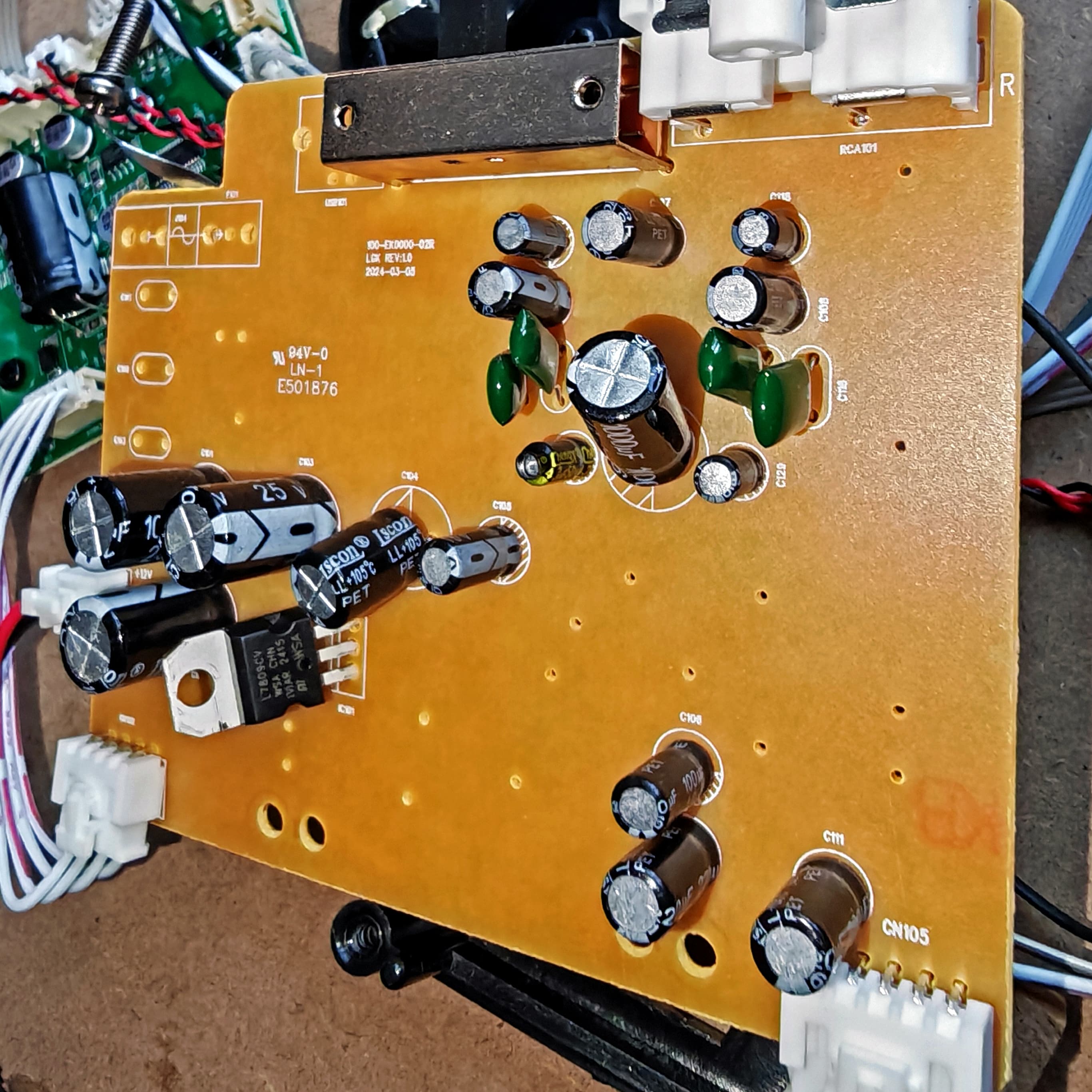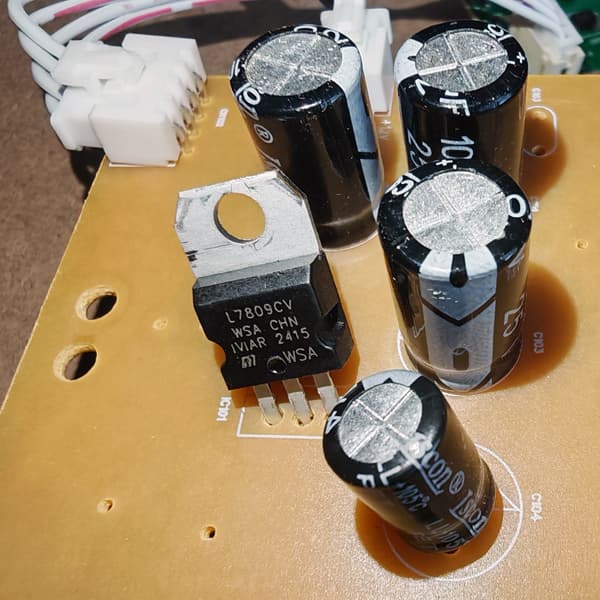 Желтая сторона платы отвечает за питание — здесь реализован простой однополярный блок на классическом стабилизаторе 7809.