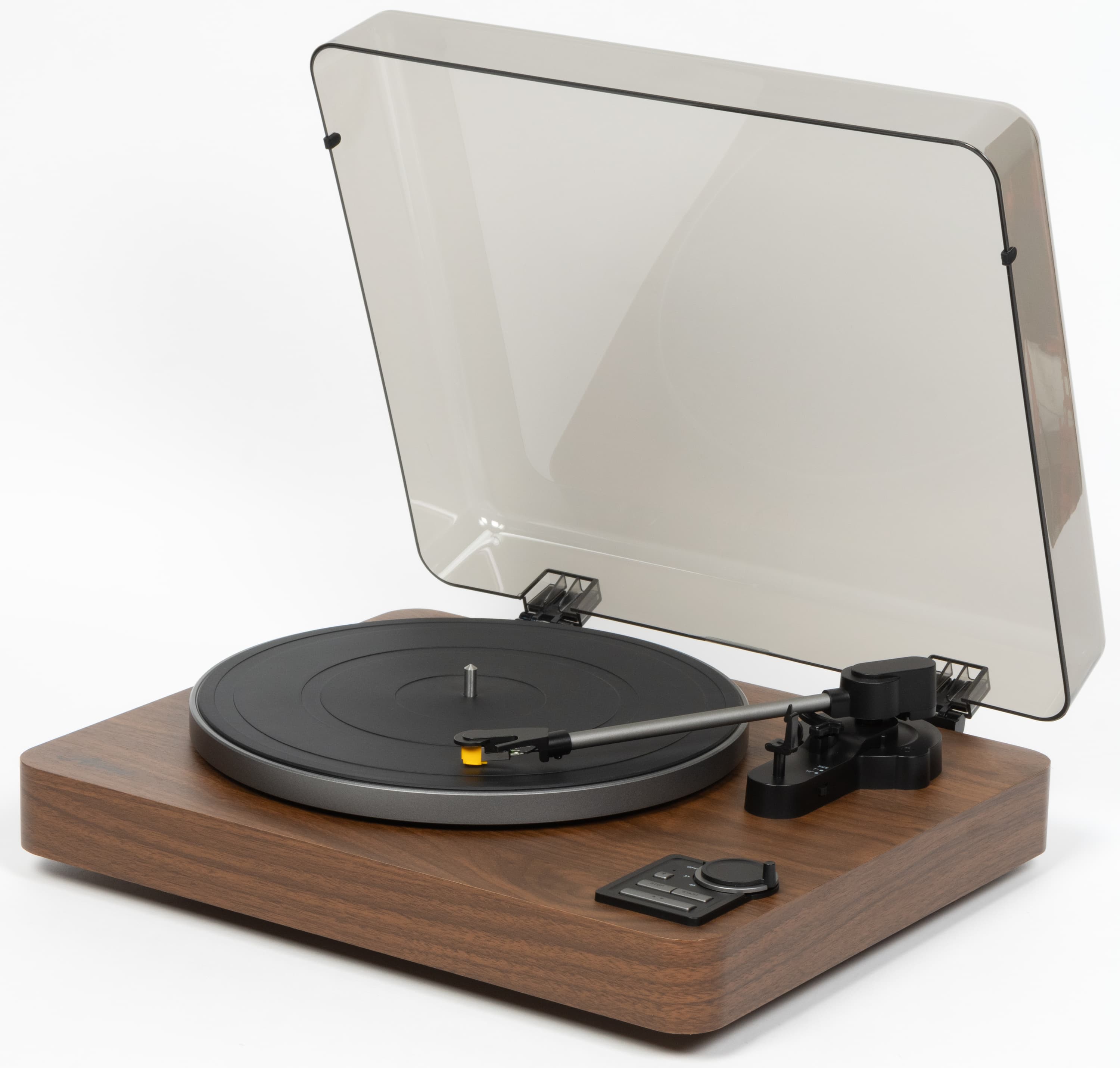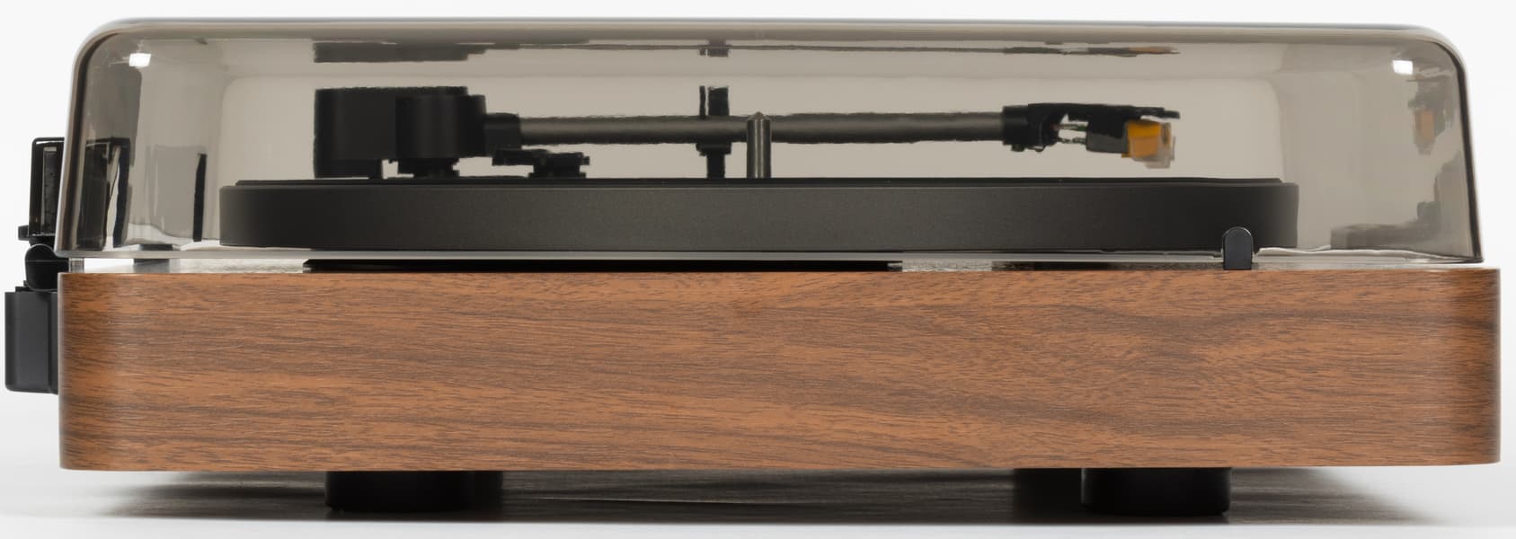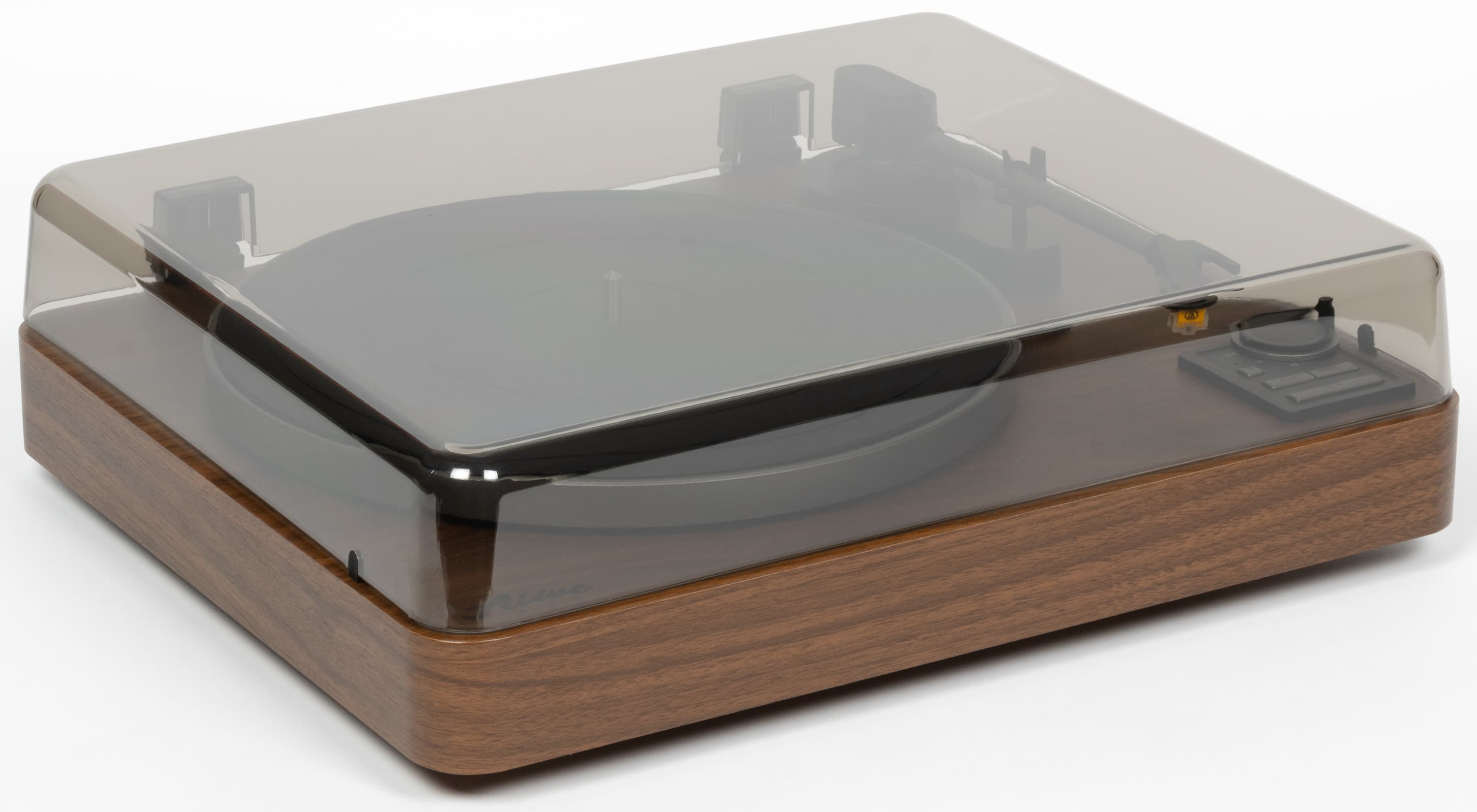 Пылезащитная крышка с легким дымчатым оттенком делает оформление более цельным, но не мешает наблюдать за вращением винила и движением тонарма.