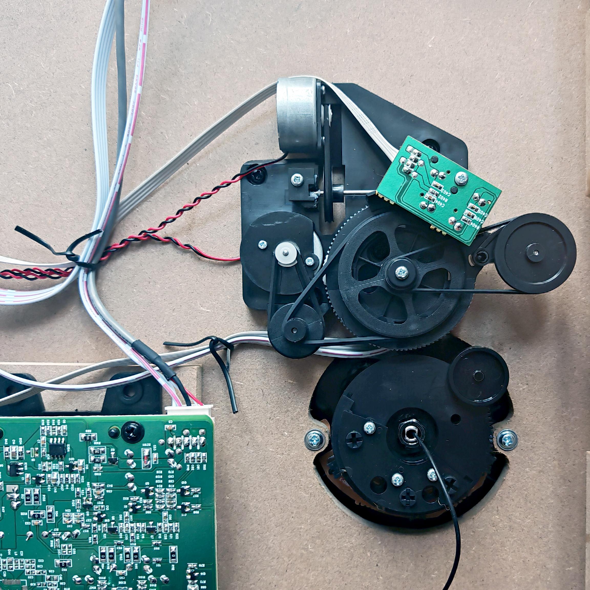 Механизм перемещения тонарма сделан из пластика. Смазки немного, но она все же присутствует. Привод у всех ключевых узлов пассиковый. На сверхнадежность рассчитывать не приходится, но в целом конструкция производит впечатление способной проработать довольно долго. Хотя, конечно, больше движущихся частей — больше шансов на возникновение неисправностей, такова цена полностью автоматической работы.