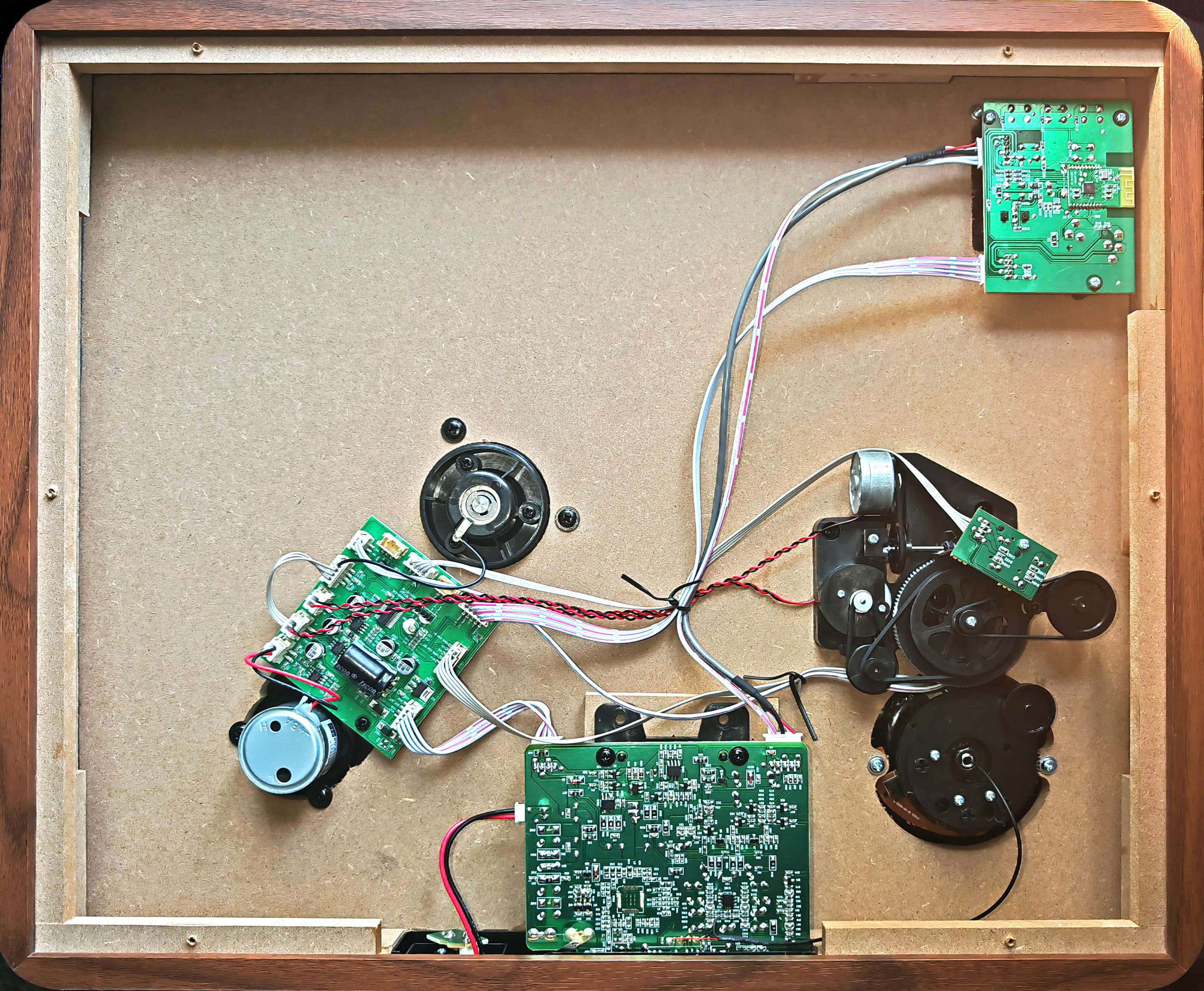 Дно корпуса закреплено несколькими саморезами и легко снимается. Внутри — три печатные платы и механизм движения тонарма. Сам корпус выполнен из плотного MDF толщиной 10 мм.