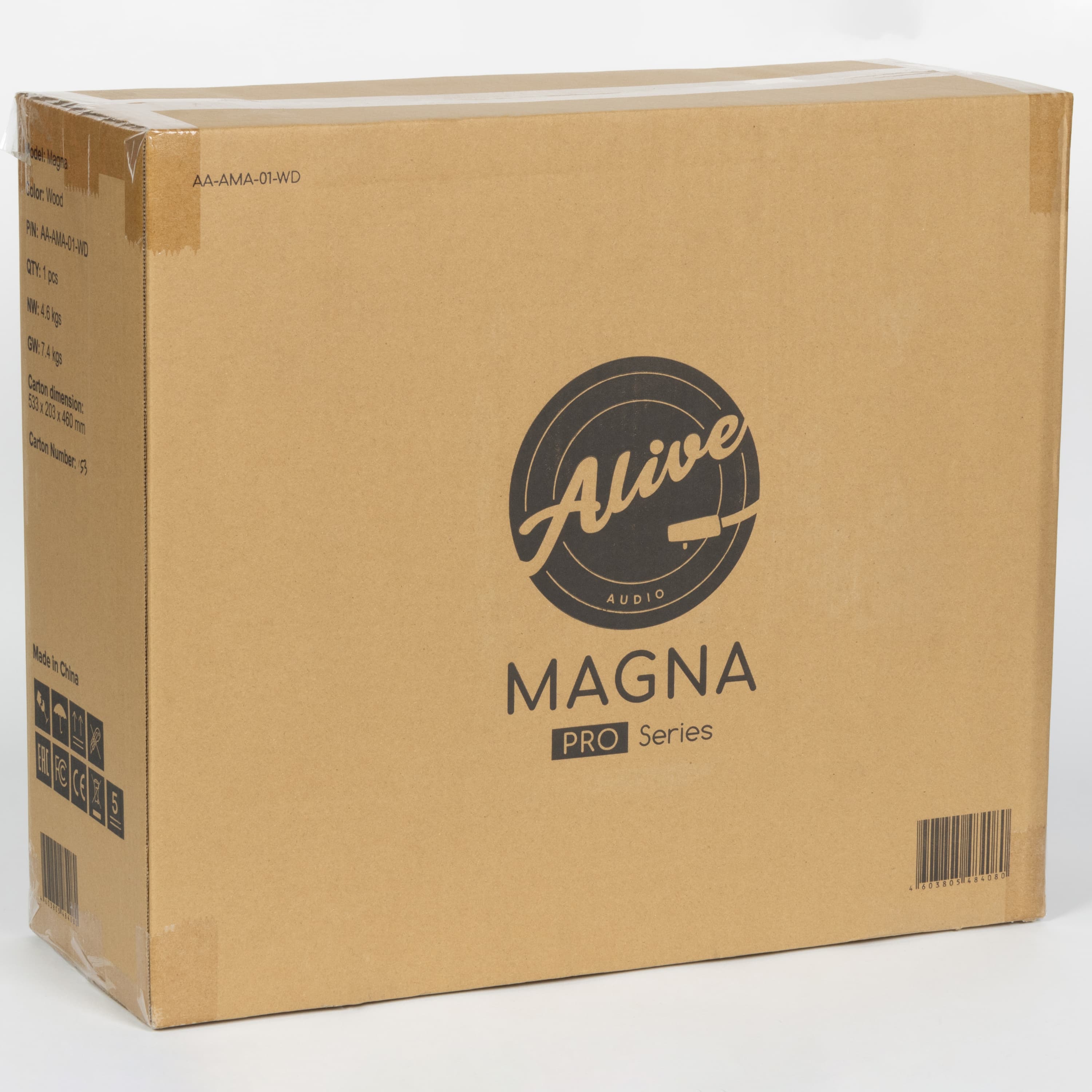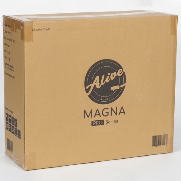 Проигрыватель Alive Audio Magna прибыл к нам сразу в двух коробках. Первая — транспортировочная: плотный неокрашенный картон, минимум информации, логотип и название модели. Ее задача — взять на себя все тяготы доставки и надежно защитить содержимое. Вторая — уже «парадная». Картон здесь тоньше, но все еще достаточно прочный. На упаковке — яркие иллюстрации, логотипы, описание и прочие элементы, отвечающие за приятное первое впечатление от продукта.