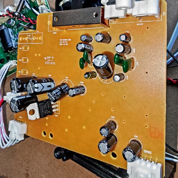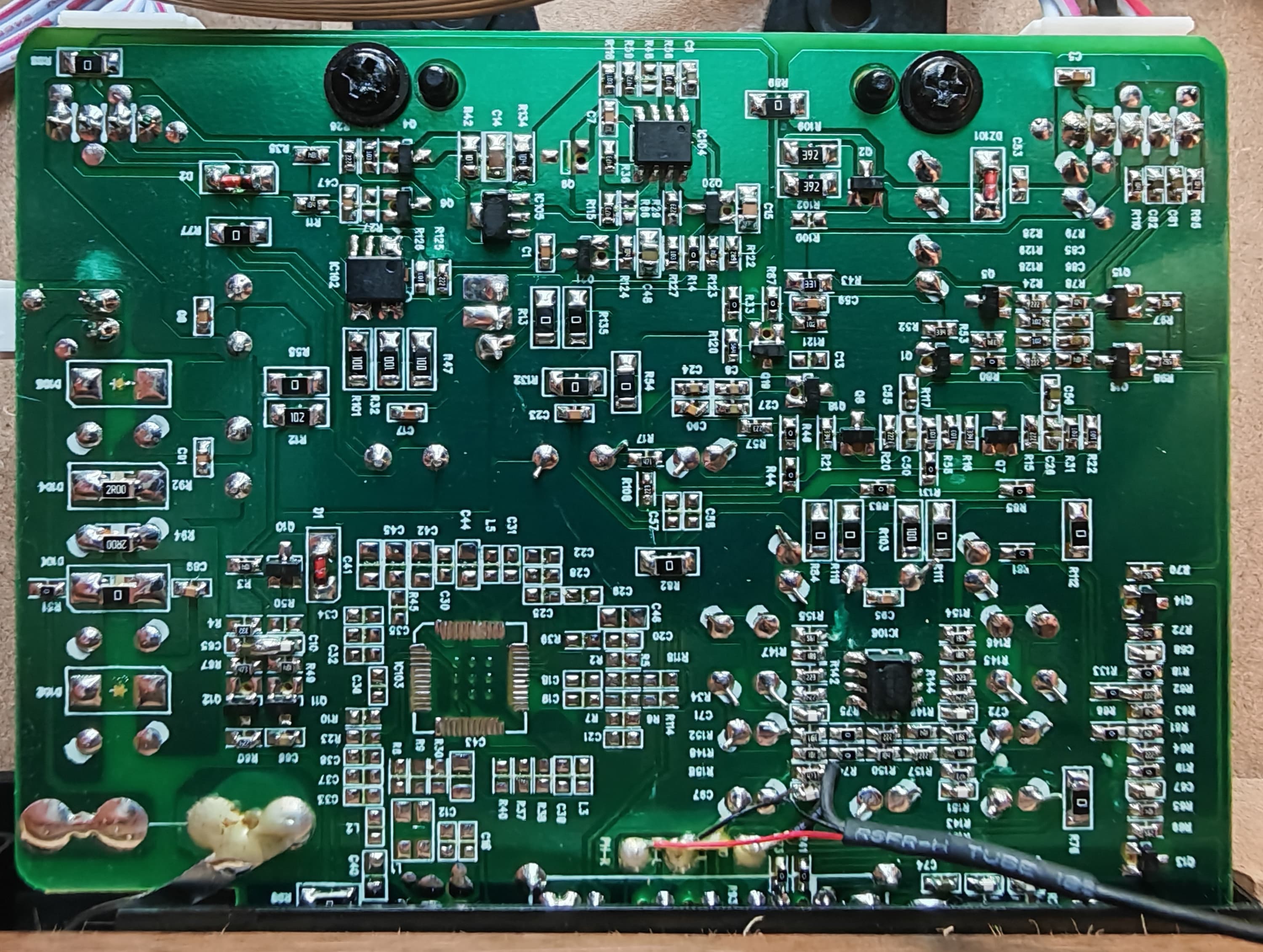 В самом низу корпуса расположена самая крупная плата. На ее зеленой стороне сосредоточена аудиочасть — она отвечает за предусиление и обработку сигнала, поступающего с головки проигрывателя. В качестве усилителей используются микросхемы с плохо читаемой маркировкой — предположительно JRC4580 и/или TL062. Разводка платы аккуратная, следов флюса почти нет. Экранирование и развязка по земле отсутствуют, что вполне ожидаемо для устройств этого уровня.