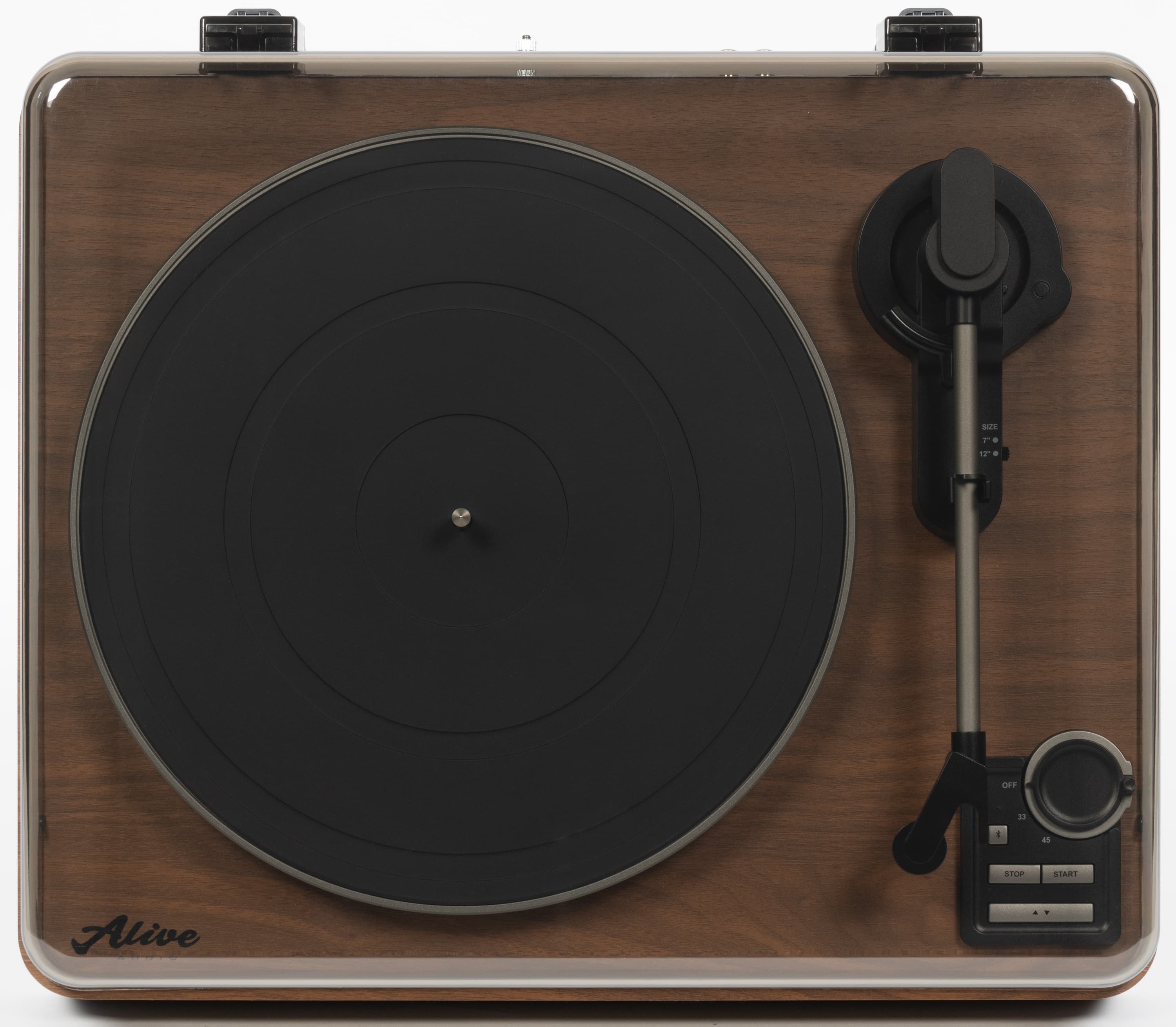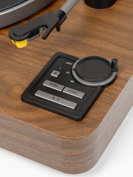 Управление Alive Audio Magna осуществляется с помощью панели, размещенной в правом нижнем углу стола. Поворотный регулятор на ней отвечает за выбор скорости вращения, а также включение и выключение устройства. Кнопка со значком Bluetooth запускает беспроводное соединение: сначала проигрыватель пытается подключиться к «знакомым» устройствам, потом активирует режим сопряжения. Нажимаются все клавиши с приятным усилием чуть выше среднего и громким отчетливым кликом.