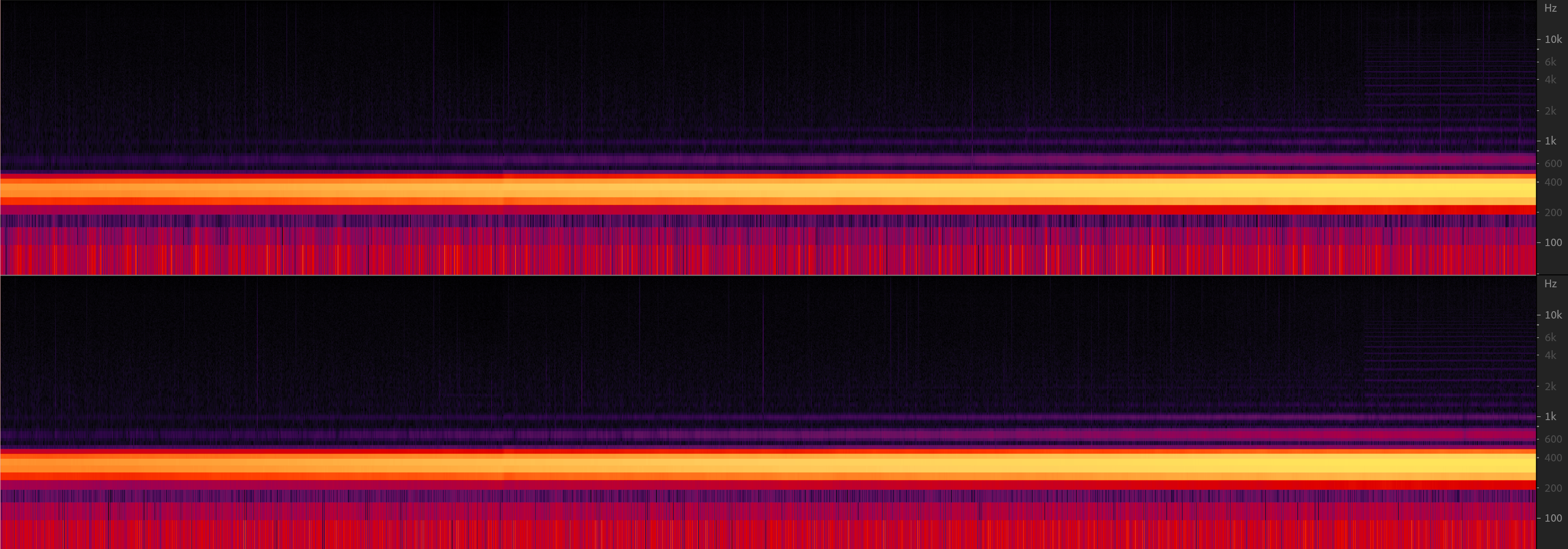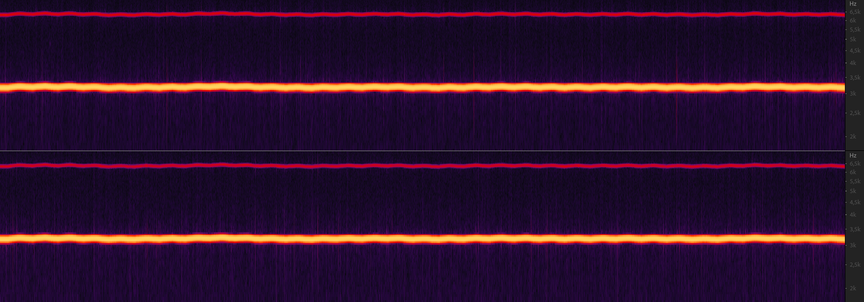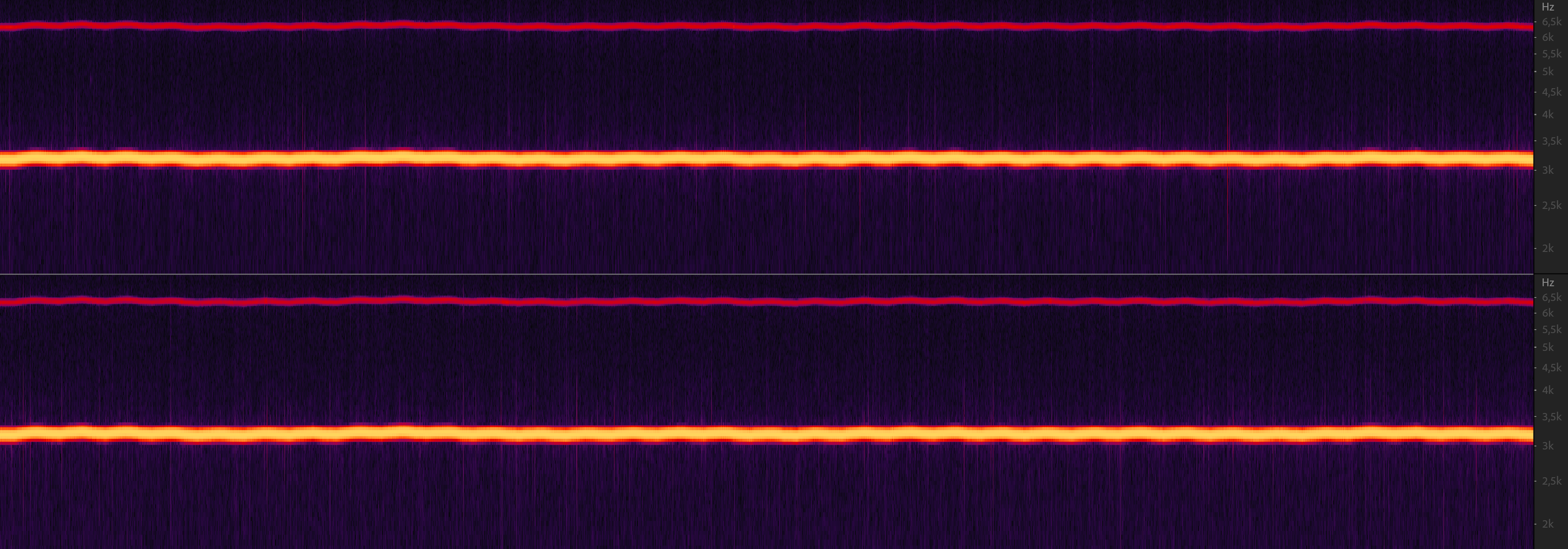 Следующий тест призван проверить так называемый «коэффициент детонаций», в англоязычной литературе называемый wow&flutter. Показывает он способность проигрывателя поддерживать стабильную скорость вращения пластинки. Wow — это медленное «плавание» звука, искажающее высоту звучания. Ну а Flutter — это «дрожание» скорости, приводящее к снижению детализации. Запишем сигнал частотой 3150 Гц с тестовой пластинки и посмотрим на его спектрограмму.