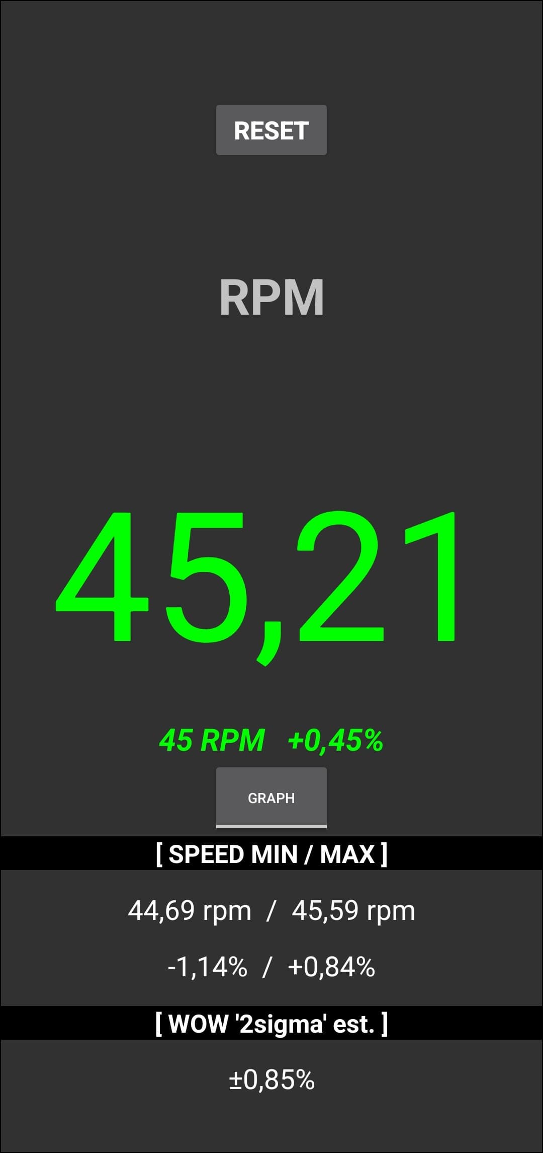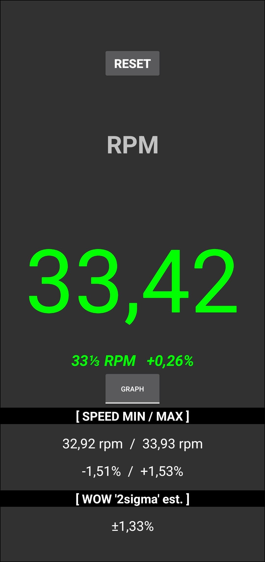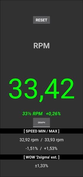 Снова всё очень неплохо — сигнал практически равномерный, он не «плывет» и не «дрожит», в заданную частоту попадает. Более наглядные данные мы получили с помощью приложения RPM Speed&Wow: