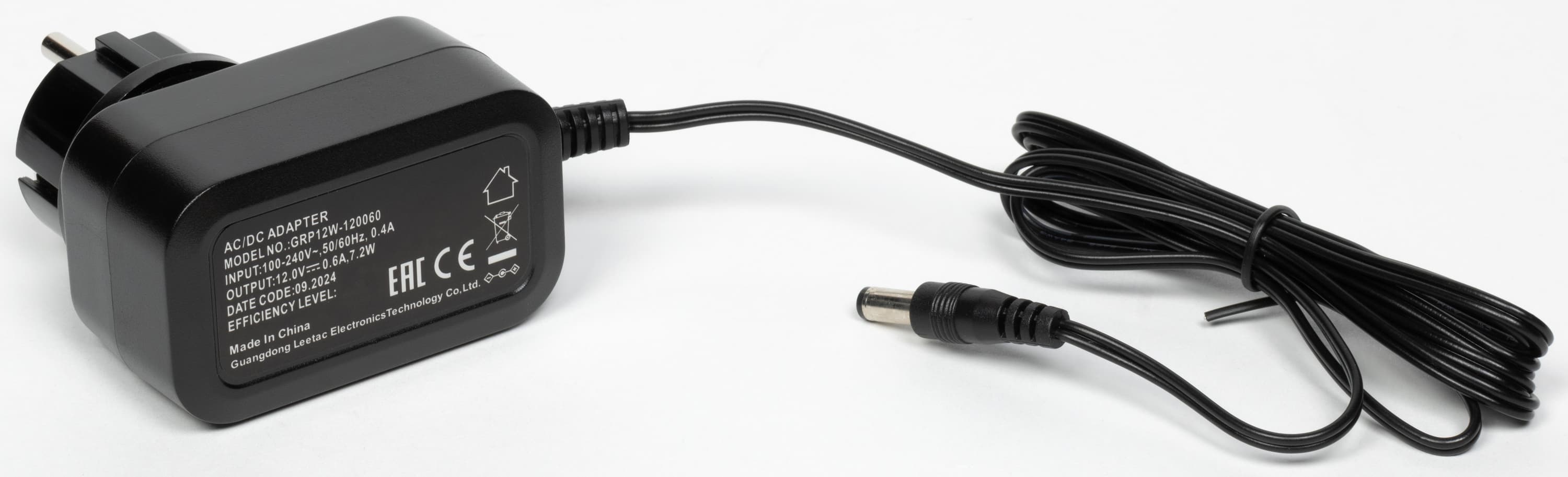 Адаптер питания компактный, технические характеристики можно увидеть на фото ниже, длина кабеля — 1,5 метра.