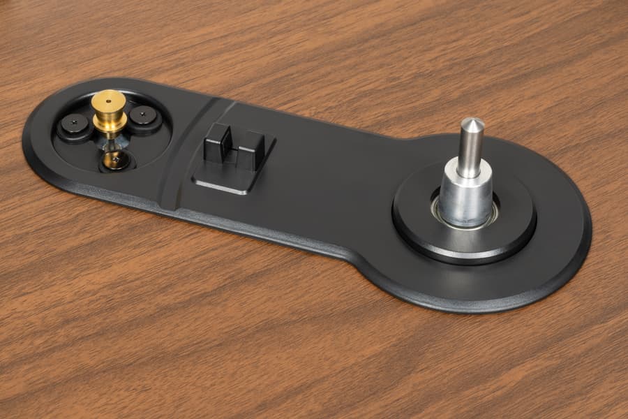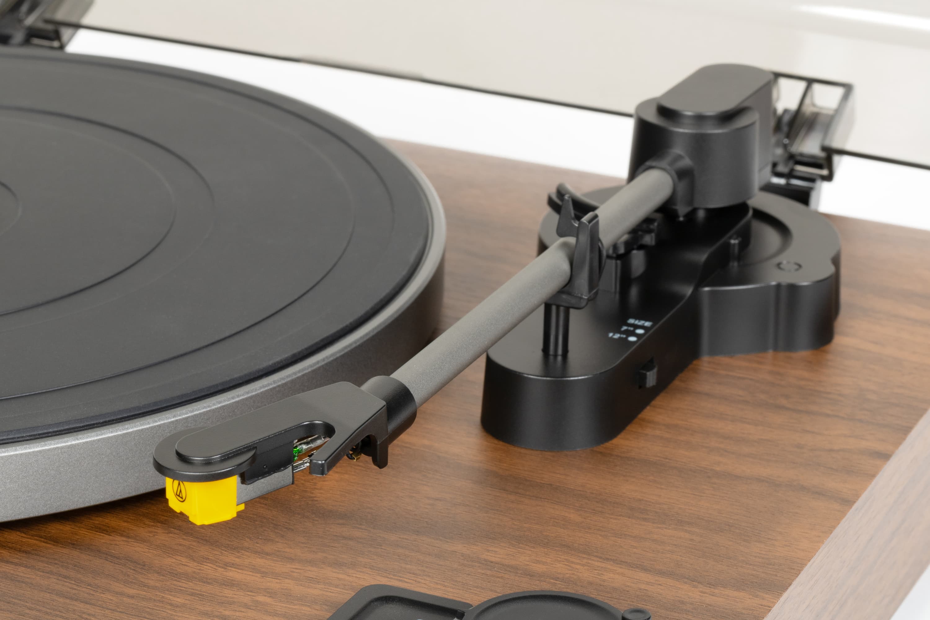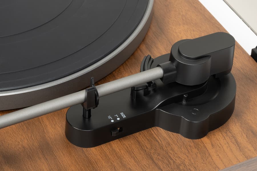 Правда за одной настройкой все же придется следить: правильно выбирать размер пластинки — иначе автоматика не поймет, где размещать тонарм на старте и когда запускать автостоп. Поддерживаются два самых распространенных формата — 7 и 12 дюймов: маленькие синглы на 45 об/мин, а также большие долгоиграющие пластинки (LP) на 33 ⅓ и макси-синглы на 45 об/мин. Выбор размера осуществляется с помощью небольшого переключателя на основании тонарма, под которым размещен механизм его перемещения.